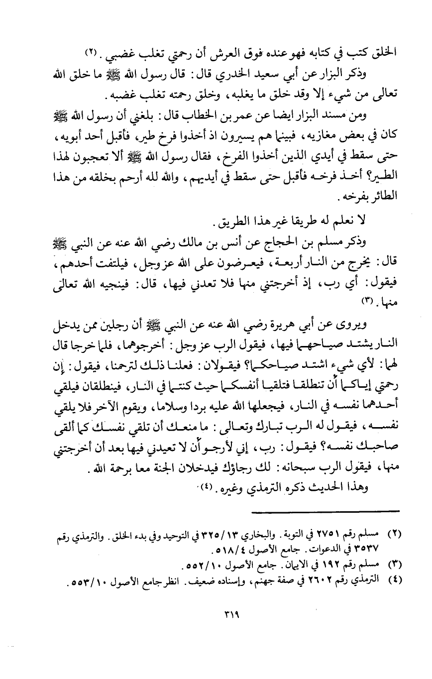 ويروى عَن أبي هُرَيْرَة رَضِي الله عَنهُ عَن النَّبِي صلى الله عَلَيْهِ وَسلم أَن رجلَيْنِ مِمَّن يدْخل النَّار يشْتَد صياحهما فِيهَا فَيَقُول الرب عز وَجل أخرجوهما فَلَمَّا خرجا قَالَ لَهما لأي شَيْء اشْتَدَّ صياحكما فَيَقُولَانِ فعلنَا ذَلِك لترحمنا فَيَقُول إِن رَحْمَتي إياكما أَن تنطلقا فتلقيا أنفسكما حَيْثُ كنتما فِي النَّار فينطلقان فيلقي أَحدهمَا نَفسه فِي النَّار فيجعلها الله عَلَيْهِ بردا وَسلَامًا وَيقوم الآخر فَلَا يلقِي نَفسه فَيَقُول لَهُ الرب تبَارك وَتَعَالَى مَا مَنعك أَن تلقي نَفسك كَمَا ألْقى صَاحبك نَفسه فَيَقُول رب إِنِّي لأرجو أَن لَا تعيدني فِيهَا بعد أَن أخرجتني مِنْهَا فَيَقُول الرب سُبْحَانَهُ لَك رجاؤك فيدخلان الْجنَّة مَعًا برحمة الله