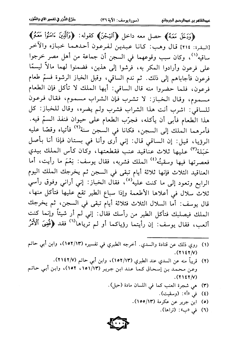 {وَدَخَلَ مَعَهُ} حصل معه داخل {السِّجْنَ} كقوله: {وَالَّذِينَ آمَنُوا مَعَهُ} [البقرة: 214] قال وهب: كانا عبدين لفرعون أحدهما خبازه والآخر ساقيه (¬1)، وكان سبب وقوعهما في السجن أن جماعة من أهل مصر خرجوا على فرعون وأرادوا المكر به، فرشوا إلى هذين، فضمنوا لهما مالًا ليسمّا فرعون فأجاباهم إلى ذلك. ثم ندم الساقي، وقبل الخباز الرشوة فسمّ طعام فرعون، فلما حضروا منه قال الساقي: أيها الملك لا تأكل فإن الطعام مسموم، وقال الخباز: لا تشرب فإن الشراب مسموم، فقال فرعون للساقي: اشرب أنت هذا الشراب فشرب ولم يضره، وقال للخباز: كل هذا الطعام فأبى أن يأكله، فجرب الطعام على حيوان فنفذ السمّ فيه. فأمرهما الملك إلى السجن، فكانا في السجن سنة (¬2) فأتياه وقصّا عليه الرؤيا، قيل: إن الساقي قال: إني أرى وأنا في بستان فإذا أنا بأصل حَبَلة (¬3) عليها ثلاث عناقيد عنب فقطعتها، وكان كأس الملك بيدي فعصرتها فيها وسقيتُه (¬4) الملك فشربه، فقال يوسف: نِعْمَ ما رأيت، أما العناقيد الثلاث فإنها ثلاثة أيام تبقى في السجن ثم يخرجك الملك اليوم الرابع وتعود إلى ما كنت عليه (¬5)، فقال الخباز: إني أراني وفوق رأسي ثلاث سلال فى أعلاها الأطعمة وإذا سباع الطير تقع عليها فتأكل منها، قال يوسف: أما السلال الثلاث فثلاثة أيام تبقى في السجن، ثم يخرجك الملك فيصلبك فتأكل الطير من رأسك فقال: إني لم أر شيئًا وإنما كنت ألعب، فقال يوسف: إن رأيتما رؤياكما أو لم ترياها (¬6) فقد {وَقُضِيَ الْأَمْرُ