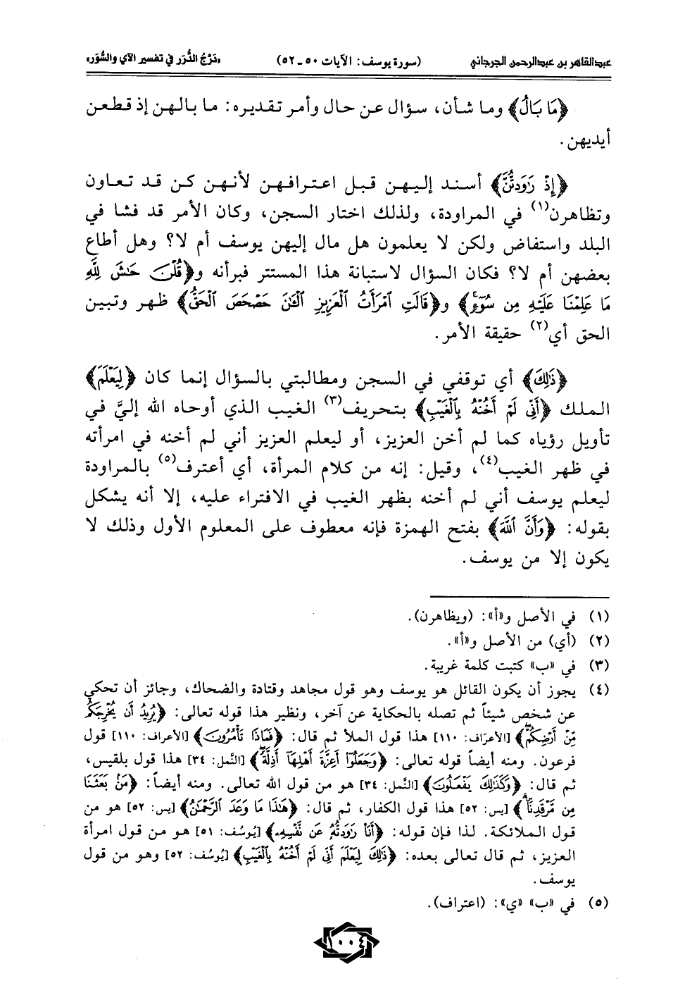 (¬4) يجوز أن يكون القائل هو يوسف وهو قول مجاهد وقتادة والضحاك، وجائز أن تحكى عن شحص شيئًا ثم تصله بالحكاية عن آخر، ونظير هذا قوله تعالى: {يُرِيدُ أَنْ يُخْرِجَكُمْ مِنْ أَرْضِكُمْ} [الأعرَاف: 110] هذا قول الملأ ثم قال: {فَمَاذَا تَأْمُرُونَ} [الأعراف: 110] قول فرعون. ومنه أيضًا قوله تعالى: {وَجَعَلُوا أَعِزَّةَ أَهْلِهَا أَذِلَّةً} [النمل: 34] هذا قول بلقيس، ثم قال {وَكَذَلِكَ يَفْعَلُونَ} [النمل: 34] هو من قول الله تعالى. ومنه أيضًا: {مَنْ بَعَثَنَا مِنْ مَرْقَدِنَا} [يس: 52] هذا قول الكفار، ثم قال: {هَذَا مَا وَعَدَ الرَّحْمَنُ} [يس: 52] هو من قول الملائكة. لذا فإن قوله: {أَنَا رَاوَدْتُهُ عَنْ نَفْسِهِ} [يُوسُف: 51] هو من قول امرأة العزيز، ثم قال تعالى بعده: {ذَلِكَ لِيَعْلَمَ أَنِّي لَمْ أَخُنْهُ بِالْغَيْبِ} [يُوسُف: 52] وهو من قول يوسف.