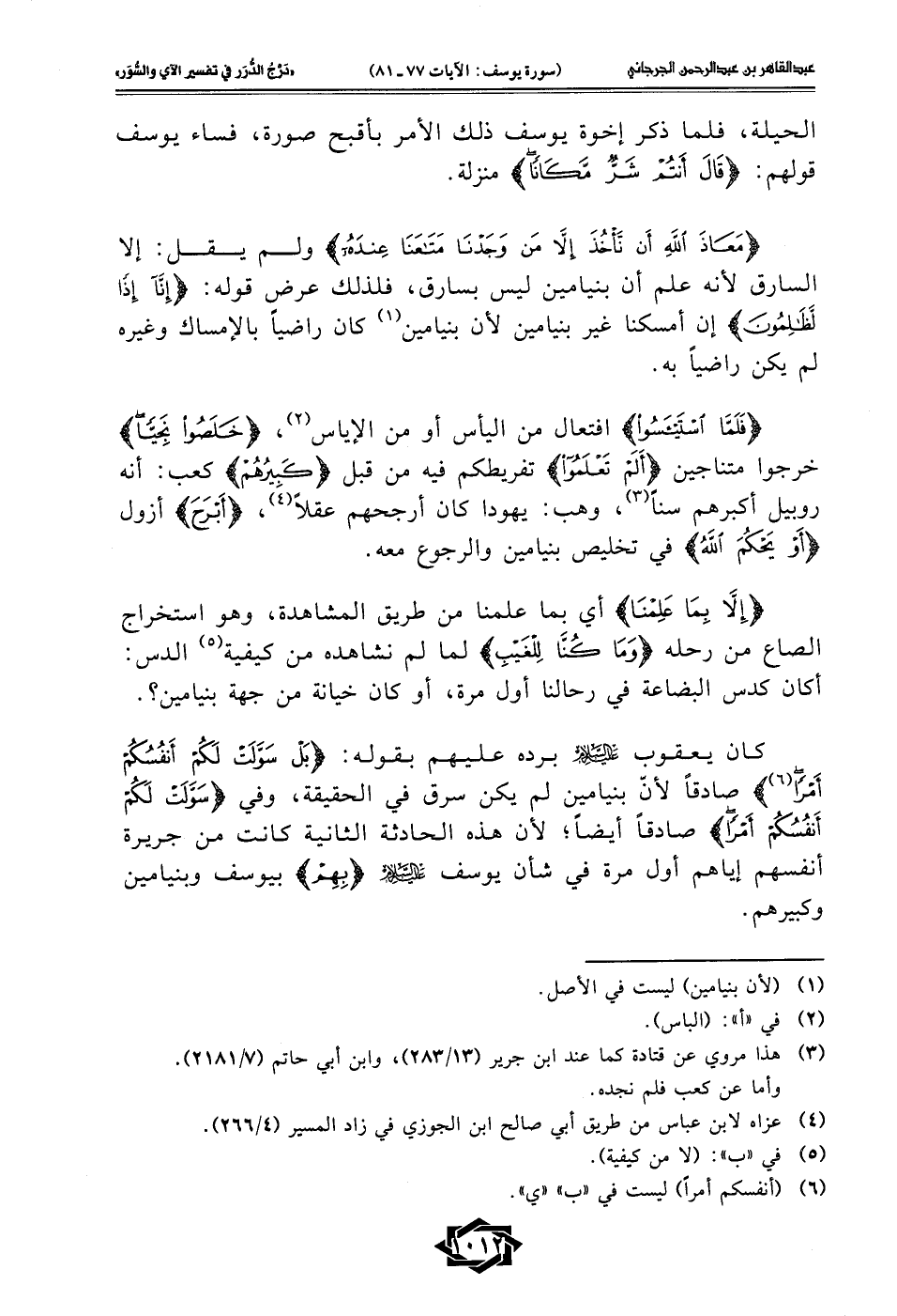 كان يعقوب -عليه السلام- برده عليهم بقوله: {بَلْ سَوَّلَتْ لَكُمْ أَنْفُسُكُمْ أَمْرًا} (¬6) صادقًا لأن بنيامين لم يكن سرق في الحقيقة، وفي {سَوَّلَتْ لَكُمْ أَنْفُسُكُمْ أَمْرًا} صادقًا أيضًا؛ لأن هذه الحادثة الثانية كانت من جريرة أنفسهم إياهم أول مرة في شأن يوسف -عليه السلام- {بِهِمْ} بيوسف وبنيامين وكبيرهم.