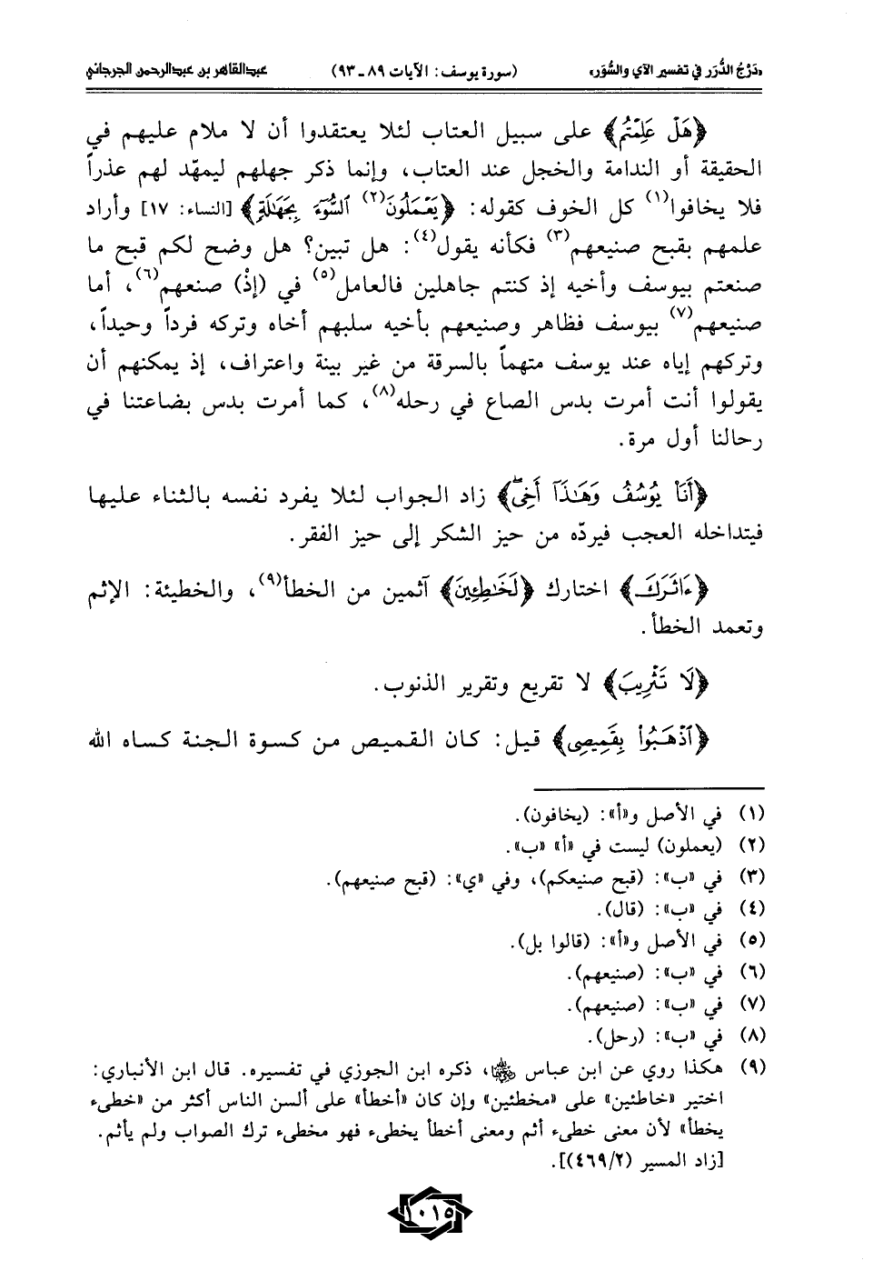 (¬9) هكذا روي عن ابن عباس - رضي الله عنهما -، ذكره ابن الجوزي في تفسيره. قال ابن الأنباري: اختير "خاطئين" على "مخطئين" وإن كان "أخطأ" على ألسن الناس أكثر من "خطىء يخطأ" لأن معنى خطىء أثم ومعنى أخطأ يخطئ فهو مخطئ ترك الصواب ولم يأثم.