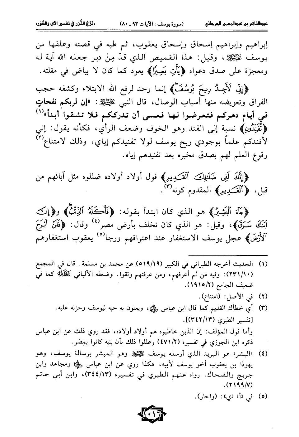 (¬4) "البشر" هو البريد الذي أرسله يوسف -عليه السلام- وهو المبشر برسالة يوسف، وهو يهوذا بن يعقوب أخو يوسف لأبيه، هكذا روي عن ابن عباس - رضي الله عنهما - ومجاهد وابن جريج والضحاك. رواه عنهم الطبري في تفسيره (13/ 344)، وابن أبي حاتم (7/ 2199).