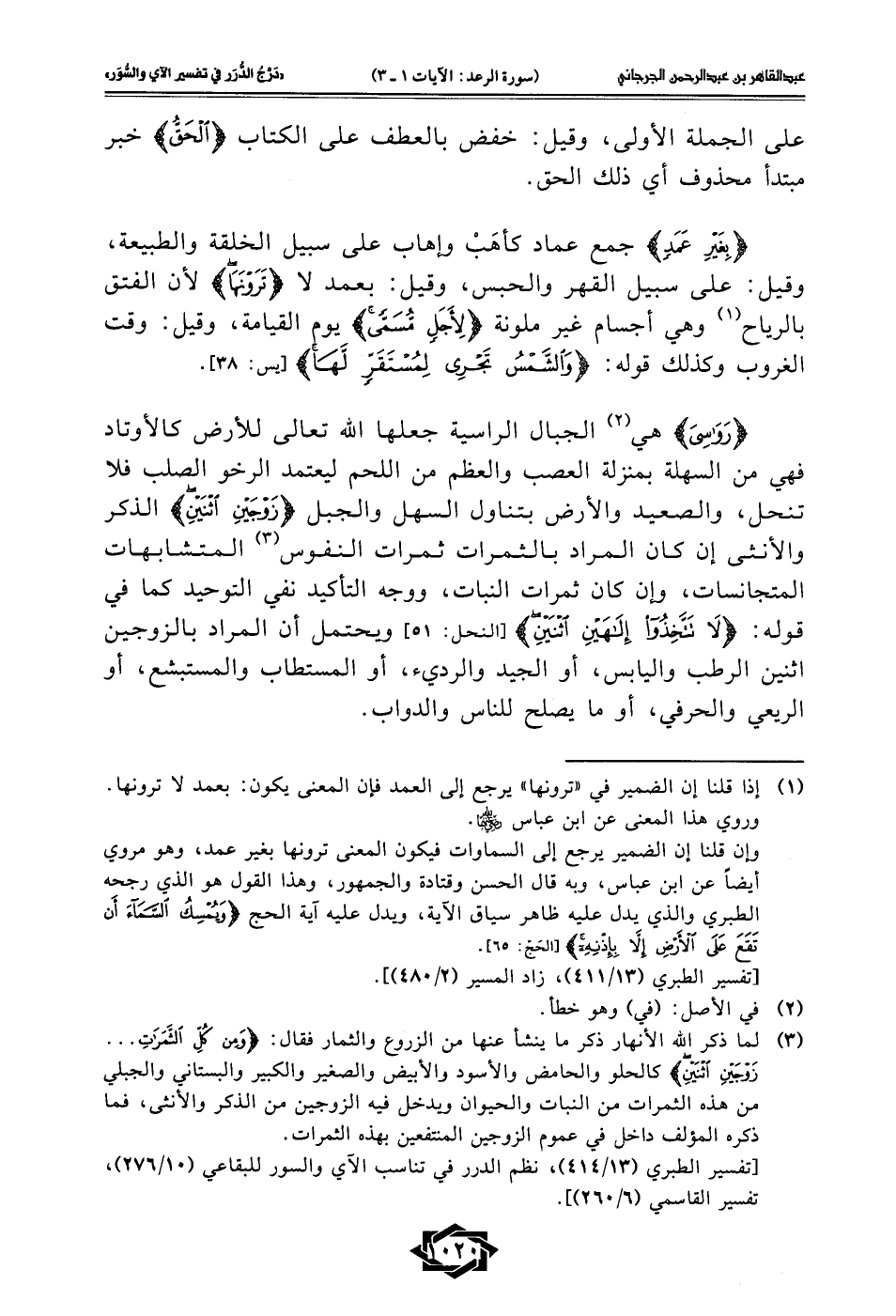(¬1) إذا قلنا إن الضمير في "ترونها" يرجع إلى العمد فإن المعنى يكون: بعمد لا ترونها. وروي هذا المعنى عن ابن عباس - رضي الله عنهما -.