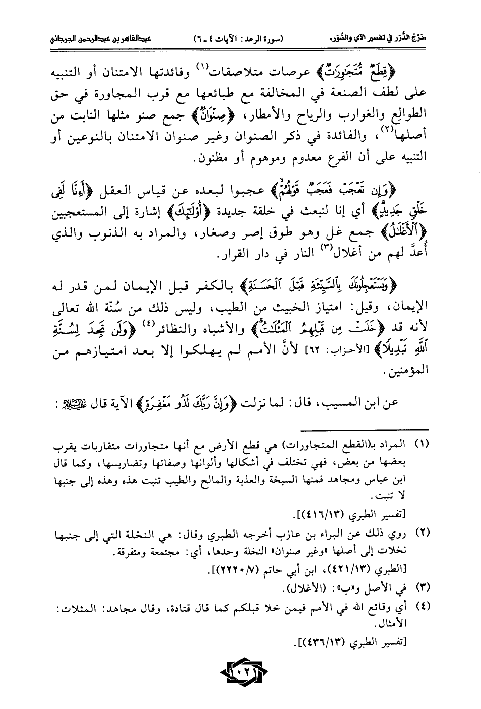 (¬1) المراد بـ (القطع المتجاورات) هي قطع الأرض مع أنها متجاورات متقاربات يقرب بعضها من بعض، فهي تختلف في أشكالها وألوانها وصفاتها وتضاريسها، وكما قال ابن عباس ومجاهد فمنها السبخة والعذبة والمالح والطيب تنبت هذه وهذه إلى جنبها لا تنبت.