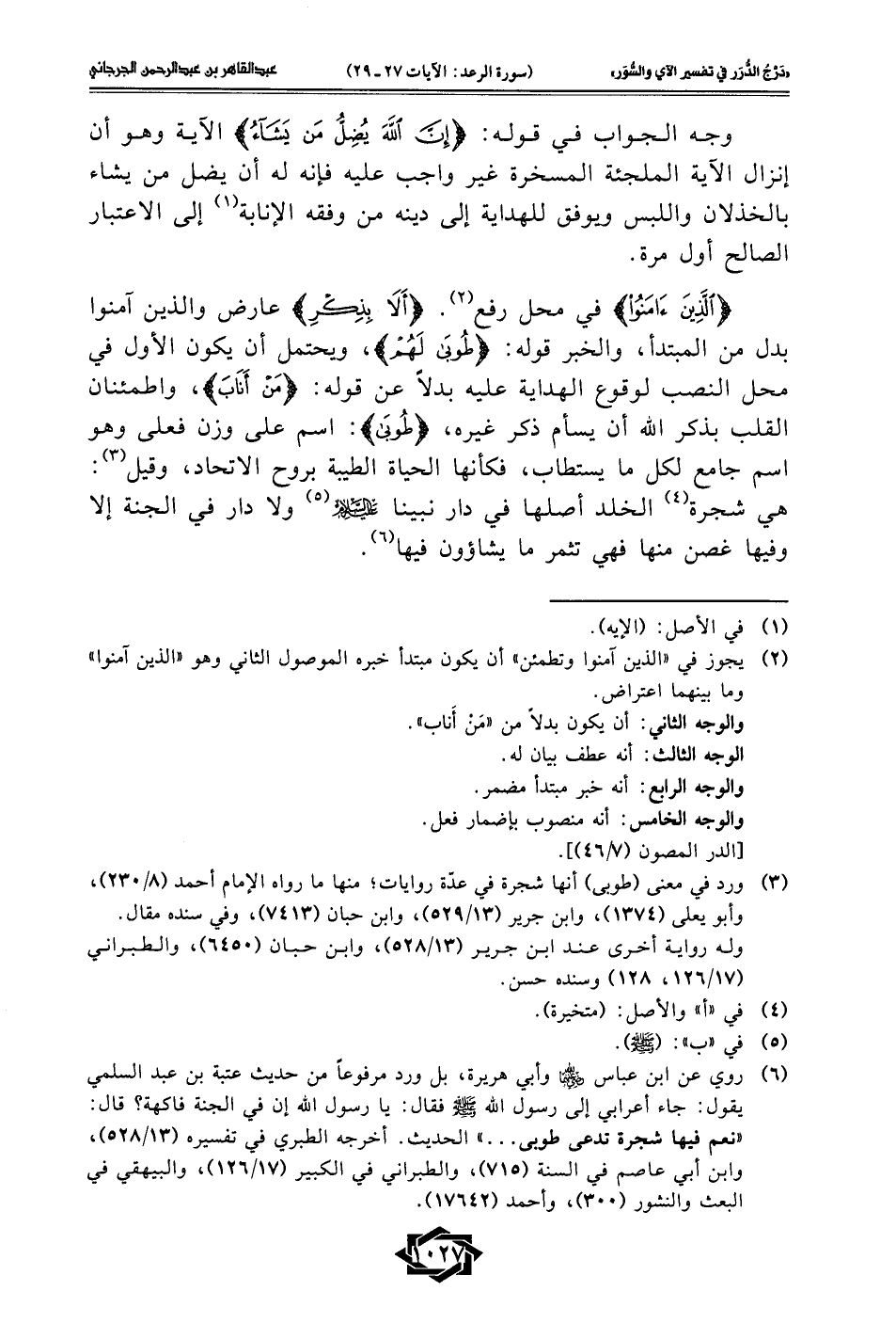 (¬6) روي عن ابن عباس - رضي الله عنهما - وأبي هريرة، بل ورد مرفوعًا من حديث عتبة بن عبد السلمي يقول: جاء أعرابي إلى رسول الله - صلى الله عليه وسلم - فقال: يا رسول الله إن في الجنة فاكهة؟ قال: "نعم فيها شجرة تدعى طوبى ... " الحديث. أخرجه الطبري في تفسيره (13/ 528)، وابن أبي عاصم في السنة (715)، والطبراني في الكبير (17/ 126)، والبيهقي في البعث والنشور (300)، وأحمد (17642).