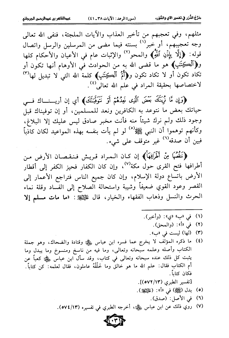{نَنْقُصُهَا مِنْ أَطْرَافِهَا} إن كان المراد قريش فنقصان الأرض من أطرافها فتح القرى حول مكة (¬7)، وإن كان الكفار فحيز الكفر إلى أقطار الأرض باتساع دولة الإسلام، وإن كان جميع الناس فتراجع الأعمار إلى القصر وعوفى القوي ضعيفًا وشيبة واستحالة الصلاح إلى الفساد وقلة نماء الحرث والنسل وذهاب الفقهاء والخيار، قال -عليه السلام-: "ما مات مسلم إلا