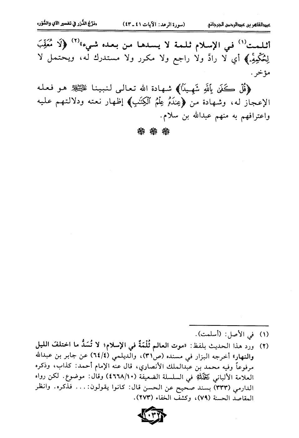 (¬2) ورد هذا الحديث بلفظ: "موت العالم ثُلْمَةٌ في الإسلام؛ لا تُسَدُّ ما اختلفَ الليل والنهار" أخرجه البزار في مسنده (ص31)، والديلمي (4/ 64) عن جابر بن عبد الله مرفوعًا وفيه محمَّد بن عبد الملك الأنصاري، قال عنه الإمام أحمد: كذاب، وذكره العلامة الألباني -رحمه الله- في السلسلة الضعيفة (10/ 4668) وقال: موضوع. لكن رواه الدارمي (333) بسند صحيح عن الحسن قال: كانوا يقولون: ... فذكره. وانظر المقاصد الحسنة (79)، وكشف الخفاء (273).