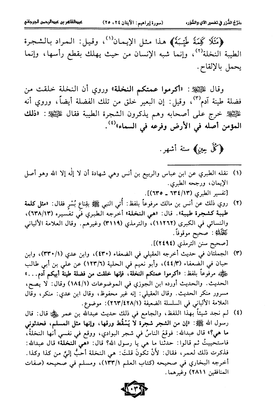 (¬2) روي ذلك عن أنس بن مالك مرفوعًا بلفظ: أُتي النبي - صلى الله عليه وسلم - بقِناعِ بُسْرٍ فقال: "مثل كلمة طيبة كشجرة طيبة". قال: "هي النخلة" أخرجه الطبري في تفسيره (13/ 638)، والنسائي في الكبرى (11262)، والترمذي (3119) وغيرهم. وقال العلامة الألباني -رحمه اللهُ-: صحيح موقوفًا.