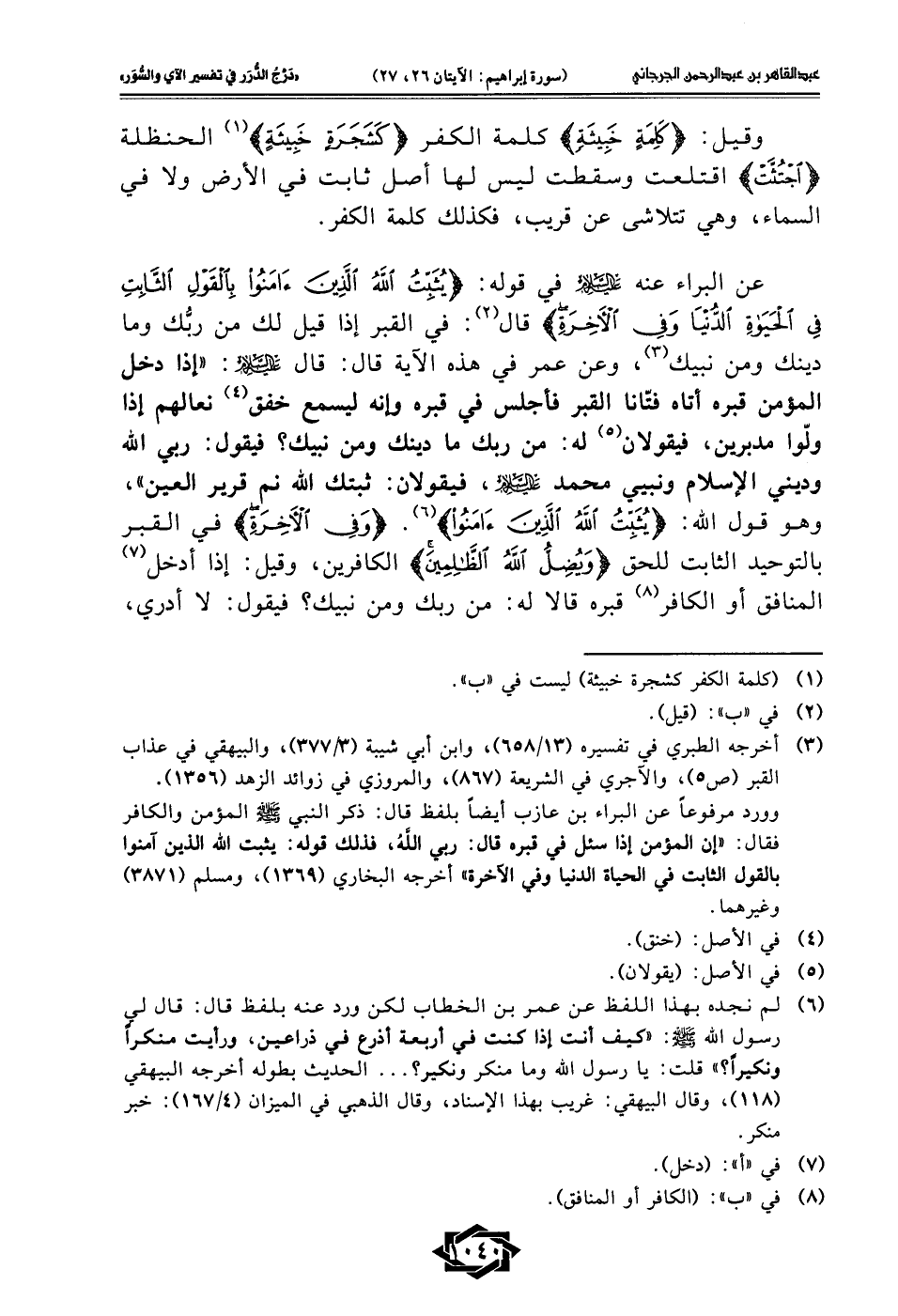 عن البراء عنه -عليه السلام- في قوله: {يُثَبِّتُ اللَّهُ الَّذِينَ آمَنُوا بِالْقَوْلِ الثَّابِتِ فِي الْحَيَاةِ الدُّنْيَا وَفِي الْآخِرَةِ} قال (¬2): في القبر إذا قيل لك من ربُّك وما دينك ومن نبيك (¬3)، وعن عمر في هذه الآية قال: قال -عليه السلام-: "إذا دخل المؤمن قبره أتاه فتّانا القبر فأجلس في قبره وانه ليسمع خفق (¬4) نعالهم إذا ولّوا مدبرين، فيقولان (¬5) له: من ربك ما دينك ومن نبيك؟ فيقول: ربي الله وديني الإسلام ونبيي محمَّد -عليه السلام-، فيقولان: ثبتك الله نم قرير العين"، وهو قول الله: {يُثَبِّتُ اللَّهُ الَّذِينَ آمَنُوا} (¬6). {وَفِي الْآخِرَةِ} في القبر بالتوحيد الثابت للحق {وَيُضِلُّ اللَّهُ الظَّالِمِينَ} الكافرين، وقيل: إذا أدخل (¬7) المنافق أو الكافر (¬8) قبره قالا له: من ربك ومن نبيك؟ فيقول: لا أدري،