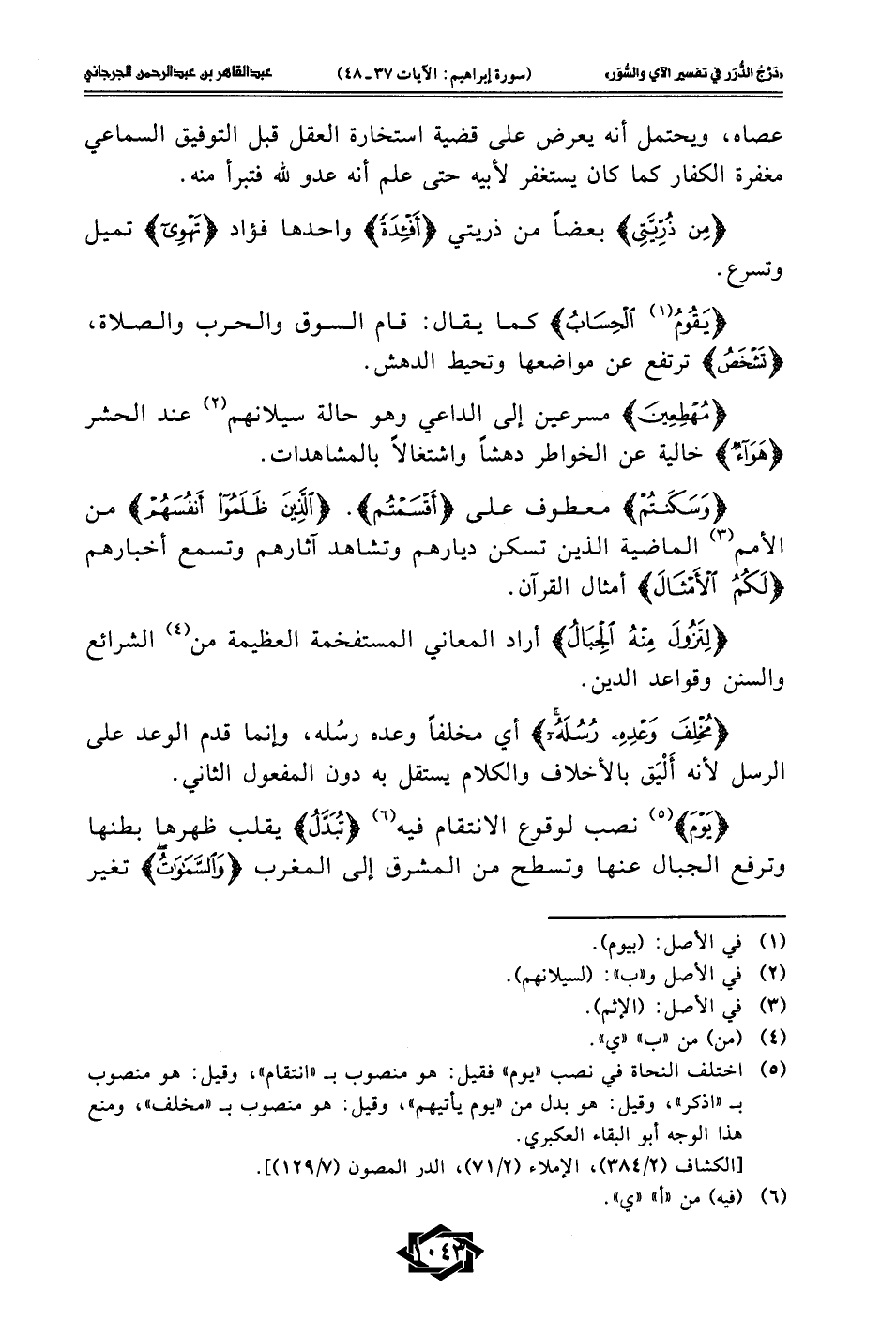(¬5) اختلف النحاة في نصب "يوم" فقيل: هو منصوب بـ"انتقام"، وقيل: هو منصوب بـ"اذكر"، وقيل: هو بدل من "يوم يأتيهم"، وقيل: هو منصوب بـ"مخلف"، ومنع هذا الوجه أبو البقاء العكبري.