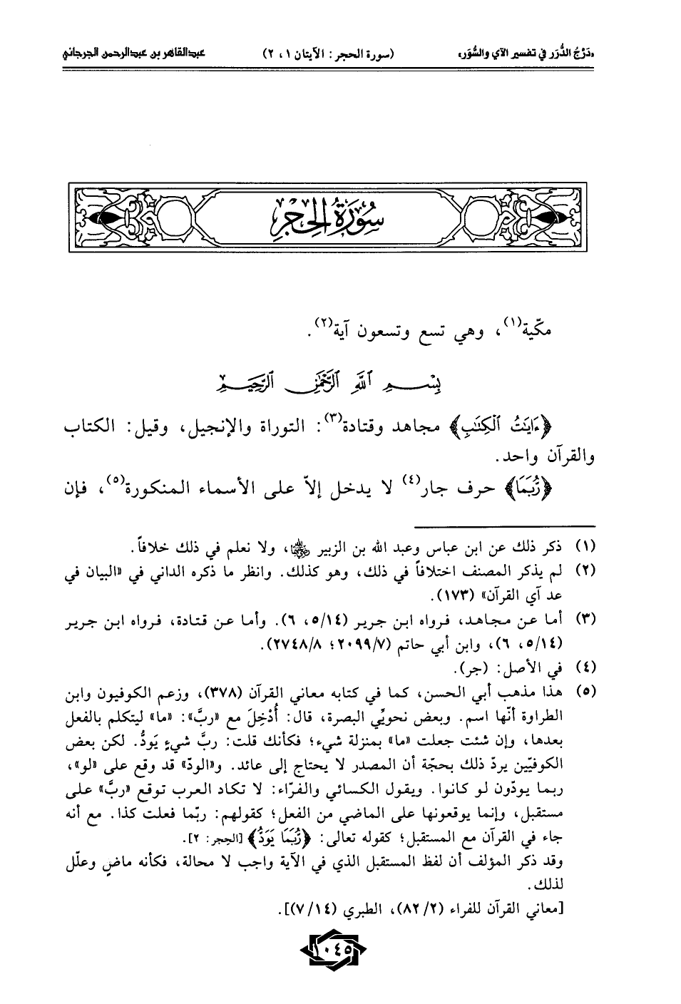 (¬5) هذا مذهب أبي الحسن، كما في كتابه معاني القرآن (378)، وزعم الكوفيون وابن الطراوة أنّها اسم. وبعض نحويِّي البصرة، قال: أُدْخِلَ مع "ربَّ": "ما" ليتكلم بالفعل بعدها، وان شئت جعلت "ما" بمنزلة شيء؛ فكأنك قلت: ربَّ شىء يَودُّ. لكن بعض الكوفيّين يردّ ذلك بحجّة أن المصدر لا يحتاج إلى عائد. و"الودّ" قد وقع على "لو"، ربما يودّون لو كانوا. ويقول الكسائي والفرّاء: لا تكاد العرب توقع "ربَّ" على مستقبل، وإنما يوقعونها على الماضي من الفعل؛ كقولهم: ربّما فعلت كذا. مع أنه جاء في القرآن مع المستقبل؛ كقوله تعالى: {رُبَمَا يَوَدُّ} [الحجر: 2].