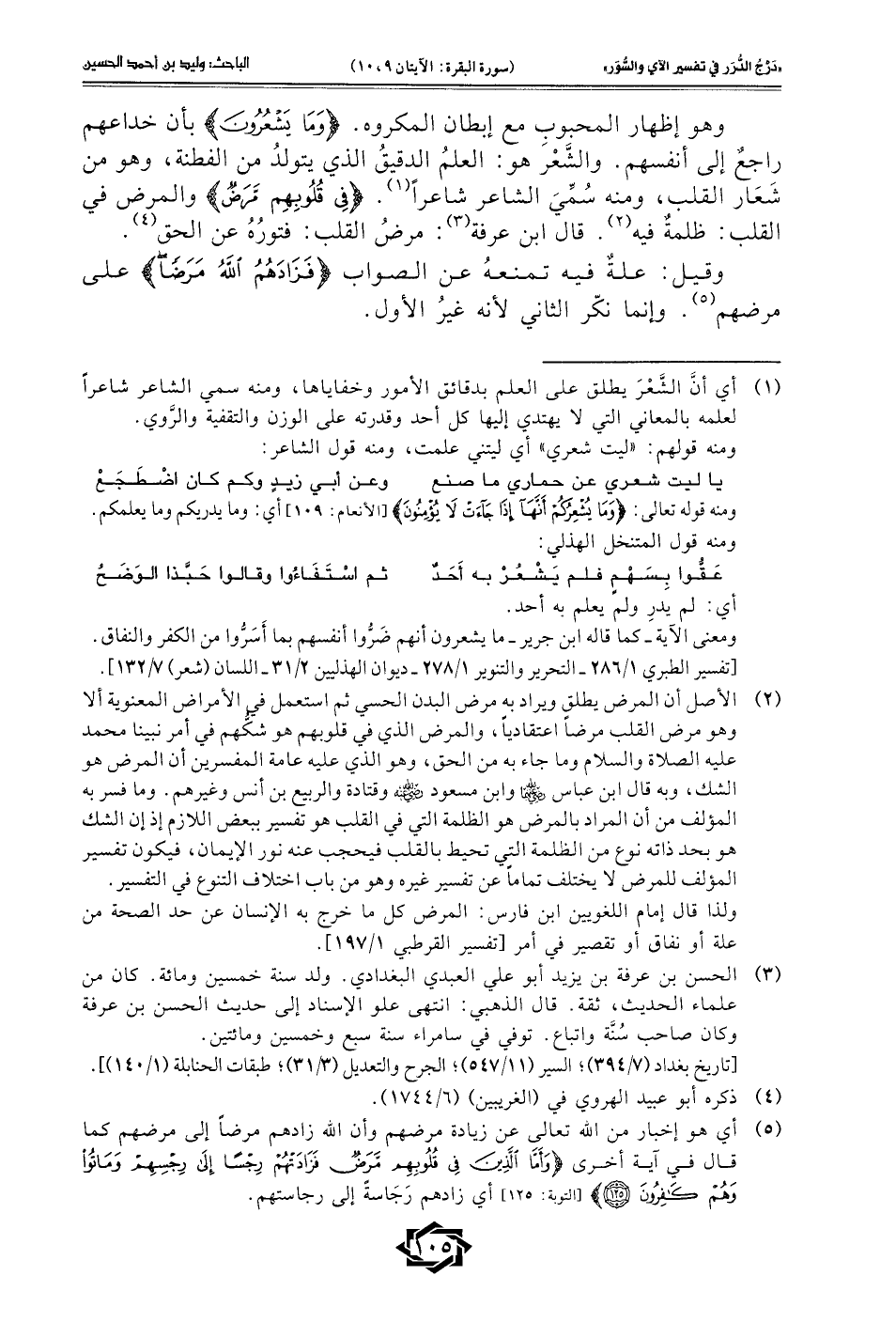 وهو إظهار المحبوب مع إبطان المكروه. {وَمَا يَشْعُرُونَ} بأن خداعهم راجع إلى أنفسهم. والشَّعْرَ هو: العلمُ الدقيقُ الذي يتولدُ من الفطنة، وهو من شَعَار القلب، ومنه سُمِّيَ الشاعر شاعرًا (¬1). {فِي قُلُوبِهِمْ مَرَضٌ} والمرض في القلب: ظلمةٌ فيه (¬2). قال ابن عرفة (¬3): مرضُ القلب: فتورُهُ عن الحق (¬4).