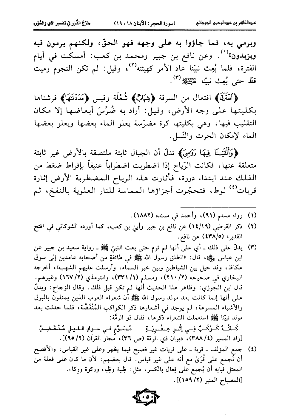 {اسْتَرَقَ} افتعال من السرقة {شِهَابٌ} شُعْلَة وقبس {مَدَدْنَاهَا} فرشناها بكليتها على وجه الأرض، وقيل: أراد به ضُرِّسَ أبعاضها إلا مكان التقليب فيها، وهي بكليتها كرة مضرّسة يعلو الماء بعضها ويعلو بعضها الماء لإمكان الحرث والنّسل.