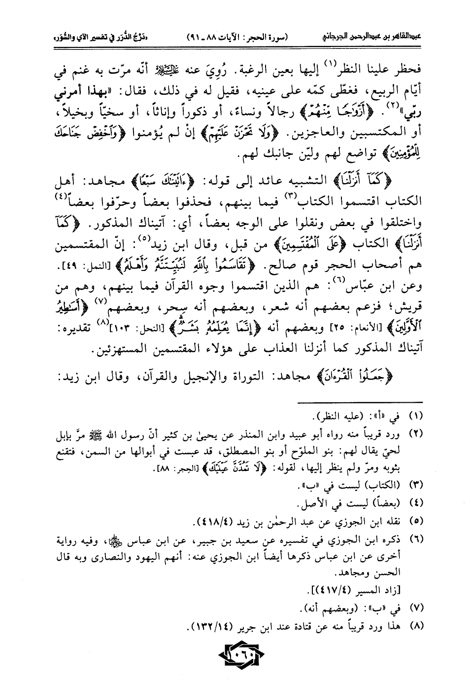 {كَمَا أَنْزَلْنَا} التشبيه عائد إلى قوله: {آتَيْنَاكَ سَبْعًا} مجاهد: أهل الكتاب اقتسموا الكتاب (¬3) فيما بينهم، فحذفوا بعضًا وحرّفوا بعضًا (¬4) واختلقوا في بعض ونقلوا على الوجه بعضًا، أي: آتيناك المذكور. {كَمَا أَنْزَلْنَا} الكتاب {عَلَى الْمُقْتَسِمِينَ} من قبل، وقال ابن زيد (¬5): إنّ المقتسمين هم أصحاب الحجر قوم صالح. {تَقَاسَمُوا بِاللهِ لَنُبَيِّتَنَّهُ وَأَهْلَهُ} [النمل: 49]. وعن ابن عبّاس (¬6): هم الذين اقتسموا وجوه القرآن فيما بينهم، وهم من قريش؛ فزعم بعضهم أنه شعر، وبعضهم أنه سِحر، وبعضهم (¬7) {أَسَاطِيرُ الْأَوَّلِينَ (25)} [الأنعام: 25]، وبعضهم أنه {إِنَّمَا يُعَلِّمُهُ بَشَرٌ} [النحل: 103] (¬8) تقديره: آتيناك المذكور كما أنزلنا العذاب على هؤلاء المقتسمين المستهزئين.