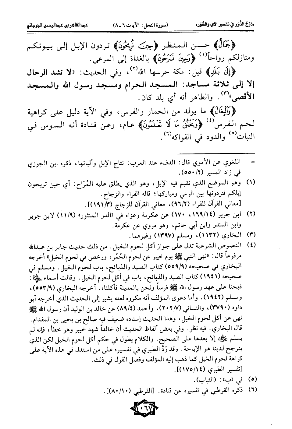 (¬4) النصوص الشرعية تدل على جواز أكل لحوم الخيل. من ذلك حديث جابر بن عبد الله مرفوعًا قال: "نهى النبي - صلى الله عليه وسلم - يوم خيبر عن لحوم الحُمُر، ورخص في لحوم الخيل" أخرجه البخاري في صحيحه (9/ 559) كتاب الصيد والذبائح، باب لحوم الخيل. ومسلم في صحيحه (1941) كتاب الصيد والذبائح، باب في أكل لحوم الخيل. وقالت أسماء -رضي الله عنها -: ذبحنا على عهد رسول الله - صلى الله عليه وسلم - فرسًا ونحن بالمدينة فأكلناه. أخرجه البخاري (9/ 553)، ومسلم (1942). وأما دعوى المؤلف أنه مكروه لعله يشير إلى الحديث الذي أخرجه أبو داود (3790)، والنسائي (7/ 202)، وأحمد (4/ 89) عن خالد بن الوليد أن رسول الله - صلى الله عليه وسلم - نهى عن أكل قوم الخيل، وهذا الحديث إسناده ضعيف فيه صالح بن يحيى بن المقدام.