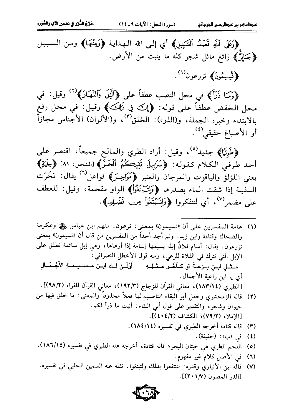 (¬1) عامة المفسرين على أن "تسيمون" بمعنى: ترعون. منهم ابن عباس - رضي الله عنهما - وعكرمة والضحاك وقتادة وابن زيد. ولم أجد أحدًا من المفسرين من قال أن "تسيمون" بمعنى تزرعون. يقال: أسام فلانٌ إبله يسيمها إسامة إذا أرعاها، وهي إبل سائمة تطلق على الإبل التي تترك في الفلاة للرعي، ومنه قول الأخطل النصراني: