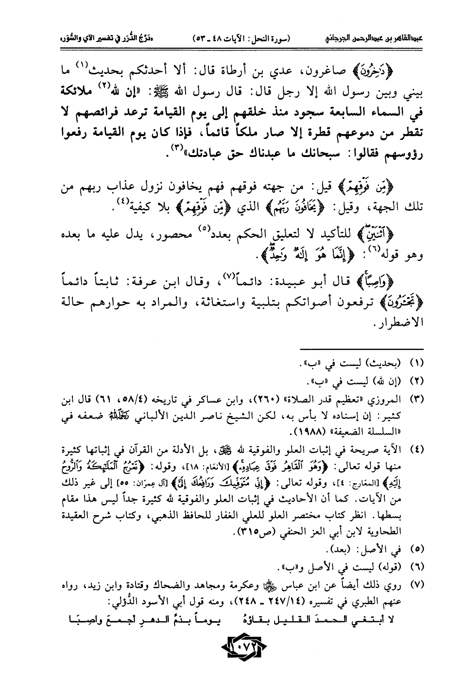 (¬4) الآية صريحة في إثبات العلو والفوقية لله -عَزَّ وَجَلَّ-، بل الأدلة من القرآن في إثباتها كثيرة منها قوله تعالى: {وَهُوَ الْقَاهِرُ فَوْقَ عِبَادِهِ} [الأنعام: 18]، وقوله: {تَعْرُجُ الْمَلَائِكَةُ وَالرُّوحُ إِلَيْهِ} [المعارج: 4]، وقوله تعالى: {إِنِّي مُتَوَفِّيكَ وَرَافِعُكَ إِلَيَّ} [آل عمران: 55]، إلى غير ذلك من الآيات. كما أن الأحاديث في إثبات العلو والفوقية لله كثيرة جدًا ليس هذا مقام بسطها. انظر كتاب مختصر العلو للعلي الغفار للحافظ الذهبي، وكتاب شرح العقيدة الطحاوية لابن أبي العز الحنفي (ص 315).