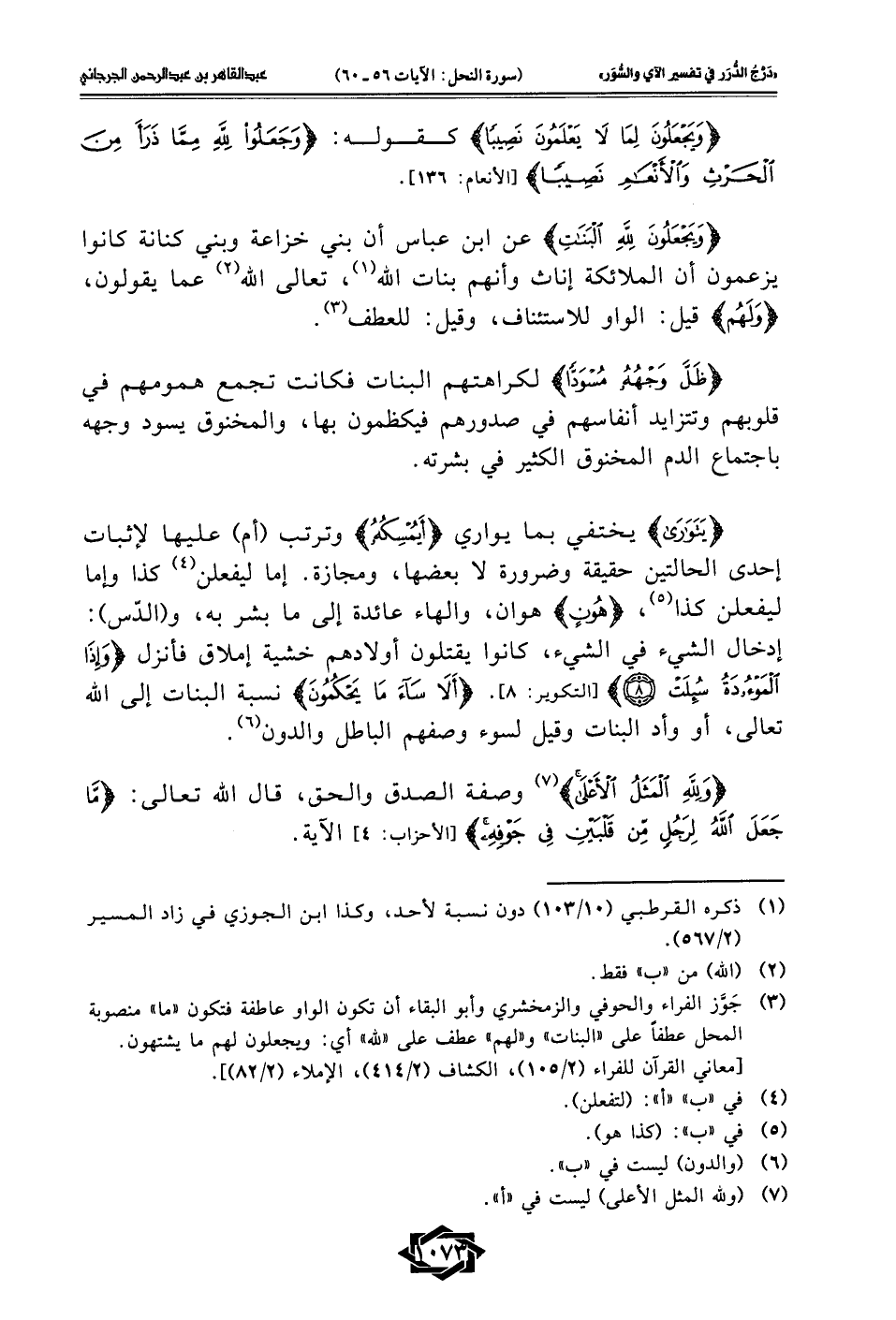 {وَيَجْعَلُونَ لِلَّهِ الْبَنَاتِ} عن ابن عباس أن بني خزاعة وبني كنانة كانوا يزعمون أن الملائكة إناث وأنهم بنات الله (¬1)، تعالى الله (¬2) عما يقولون، {وَلَهُمْ} قيل: الواو للاستئناف، وقيل: للعطف (¬3).