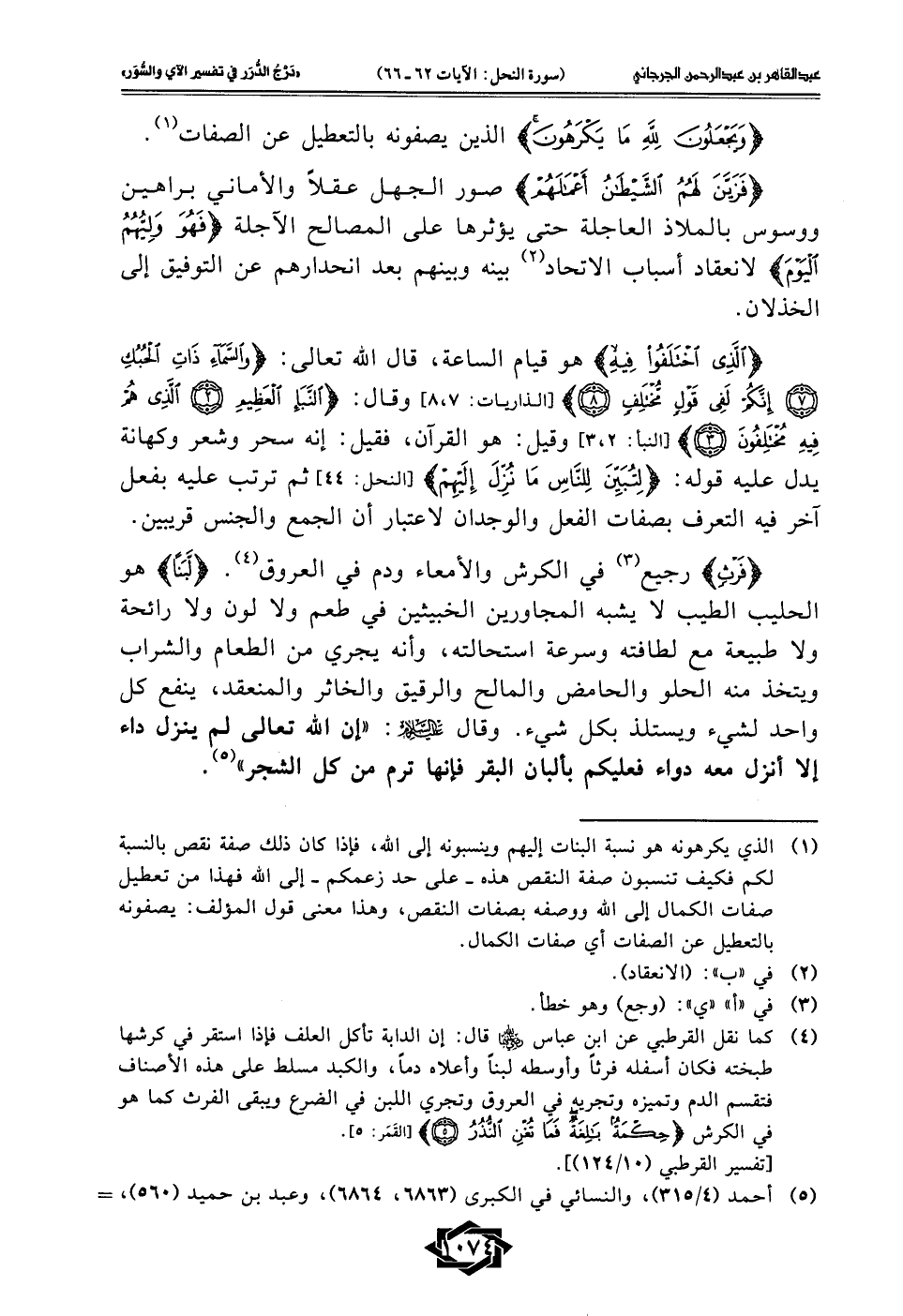 (¬4) كما نقل القرطبي عن ابن عباس - رضي الله عنهما - قال: إن الدابة تأكل العلف فإذا استقر في كرشها طبخته فكان أسفله فرثًا وأوسطه لبنًا وأعلاه دمًا، والكبد مسلط على هذه الأصناف فتقسم الدم وتميزه وتجريه في العروق وتجري اللبن في الضرع ويبقى الفرث كما هو في الكرش {حِكْمَةٌ بَالِغَةٌ فَمَا تُغْنِ النُّذُرُ (5)} [القمر: 5].