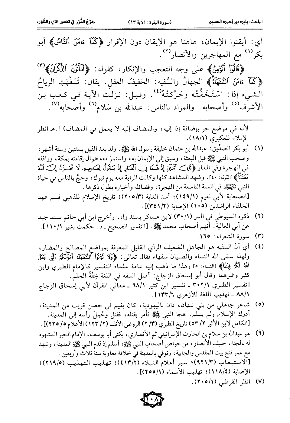 (¬6) هو عبد الله بن سلام بن الحارث الإسرائيلي ثم الأنصاري، يكنى أبا يوسف، الإمام الحبر المشهود له بالجنة، حليف الأنصار، من خواص أصحاب النبي - صلى الله عليه وسلم -، أسلم إذ قدم النبي - صلى الله عليه وسلم - المدينة، وشهد مع عمر فتح بيت المقدس والجابية، وتوفي بالمدينة في خلافة معاوية سنة ثلاث وأربعين.