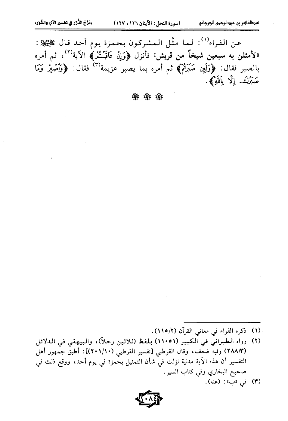 عن الفراء (¬1): لما مثَّل المشركون بحمزة يوم أحد قال -عليه السلام-: "لأمثلن به سبعين شيخًا من قريش" فأنزل {وَإِنْ عَاقَبْتُمْ} الآية (¬2)، ثم أمره بالصبر فقال: {وَلَئِنْ صَبَرْتُمْ} ثم أمره بما يصبر عزيمة (¬3) فقال: {وَاصْبِرْ وَمَا صَبْرُكَ إِلَّا بِاللهِ}.
