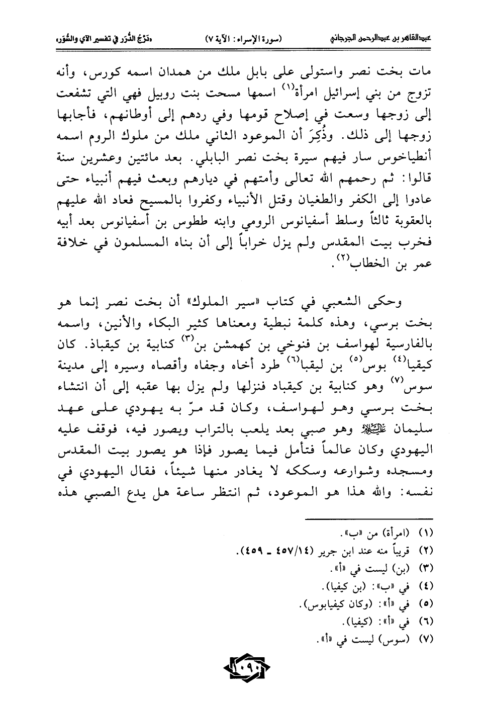 مات بخت نصر واستولى على بابل ملك من همدان اسمه كورس، وأنه تزوج من بني إسرائيل امرأة (¬1) اسمها مسحت بنت روبيل فهي التي تشفعت إلى زوجها وسعت في إصلاح قومها وفي ردهم إلى أوطانهم، فأجابها زوجها إلى ذلك. وذُكِرَ أن الموعود الثاني ملك من ملوك الروم اسمه أنطياخوس سار فيهم سيرة بخت نصر البابلي. بعد مائتين وعشرين سنة قالوا: ثم رحمهم الله تعالى وأمتهم في ديارهم وبعث فيهم أنبياء حتى عادوا إلى الكفر والطغيان وقتل الأنبياء وكفروا بالمسيح فعاد الله عليهم بالعقوبة ثالثًاَ وسلط أسفيانوس الرومي وابنه ططوس بن أسفيانوس بعد أبيه فخرب بيت المقدس ولم يزل خرابًا إلى أن بناه المسلمون في خلافة عمر بن الخطاب (¬2).
