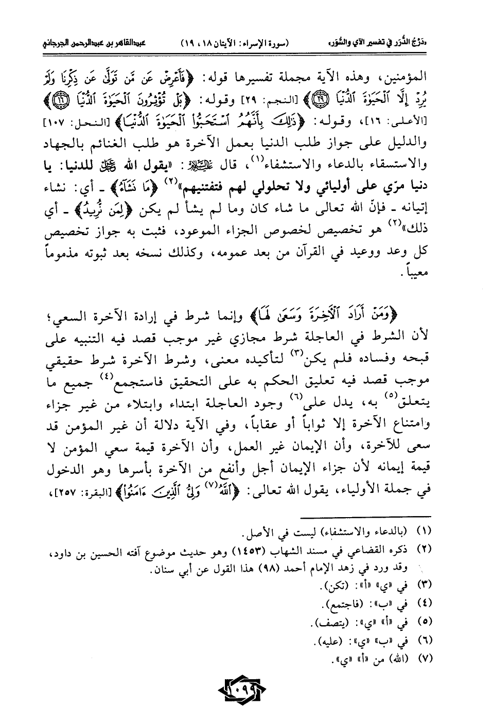 {وَمَنْ أَرَادَ الْآخِرَةَ وَسَعَى لَهَا} وإنما شرط في إرادة الآخرة السعي؛ لأن الشرط في العاجلة شرط مجازي غير موجب قصد فيه التنبيه على قبحه وفساده فلم يكن (¬3) لتأكيده معنى، وشرط الآخرة شرط حقيقي موجب قصد فيه تعليق الحكم به على التحقيق فاستجمع (¬4) جميع ما يتعلق (¬5) به، يدل على (¬6) وجود العاجلة ابتداء وابتلاء من غير جزاء وامتناع الآخرة إلا ثوابًا أو عقابًا، وفي الآية دلالة أن غير المؤمن قد سعى للآخرة، وأن الإيمان غير العمل، وأن الآخرة قيمة سعي المؤمن لا قيمة إيمانه لأن جزاء الإيمان أجل وأنفع من الآخرة بأسرها وهو الدخول في جملة الأولياء، يقول الله تعالى: {الله (¬7) وَلِيُّ الَّذِينَ آمَنُوا} [البقرة: 257] ,