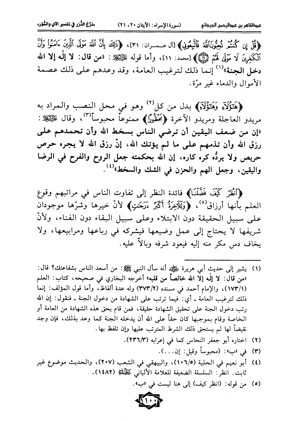 {هَؤُلَاءِ وَهَؤُلَاءِ} [الإسراء: 20] بدل من كل (¬2) وهو في محل النصب والمراد به مريدو العاجلة ومريدو الآخرة {مَحْظُورًا} ممنوعًا محبوسًا (¬3)، وقال -عليه السلام-: "إن من ضعف اليقين أن ترضي الناس بسخط الله وأن تحمدهم على رزق الله وأن تذمهم على ما لم يؤتك الله، إنّ رزق الله لا يجره حرص حريص ولا يردُّه كره كاره، إن الله بحكمته جعل الروح والفرح في الرضا واليقين، وجعل الهم والحزن في الشك والسخط" (¬4).
