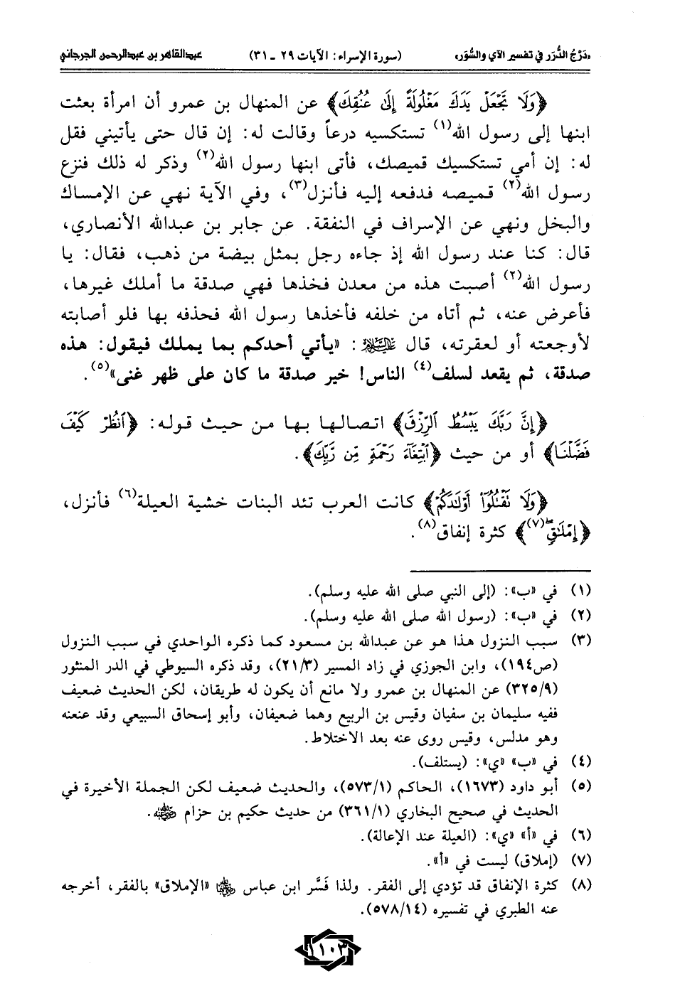 {وَلَا تَجْعَلْ يَدَكَ مَغْلُولَةً إِلَى عُنُقِكَ} عن المنهال بن عمرو أن امرأة بعثت ابنها إلى رسول الله (¬1) تستكسيه درعًا وقالت له: إن قال حتى يأتيني فقل له: إن أمي تستكسيك قميصك، فأتى ابنها رسول الله (¬2) وذكر له ذلك فنزع رسول الله (2) قميصه فدفعه إليه فأنزل (¬3)، وفي الآية نهي عن الإمساك والبخل ونهي عن الإسراف في النفقة. عن جابر بن عبد الله الأنصاري، قال: كنا عند رسول الله إذ جاءه رجل بمثل بيضة من ذهب، فقال: يا رسول الله (2) أصبت هذه من معدن فخذها فهي صدقة ما أملك غيرها، فأعرض عنه، ثم أتاه من خلفه فأخذها رسول الله فحذفه بها فلو أصابته لأوجعته أو لعقرته، قال -عليه السلام-: "يأتي أحدكم بما يملك فيقول: هذه صدقة، ثم يقعد لسلف (¬4) الناس! خير صدقة ما كان على ظهر غنى" (¬5).