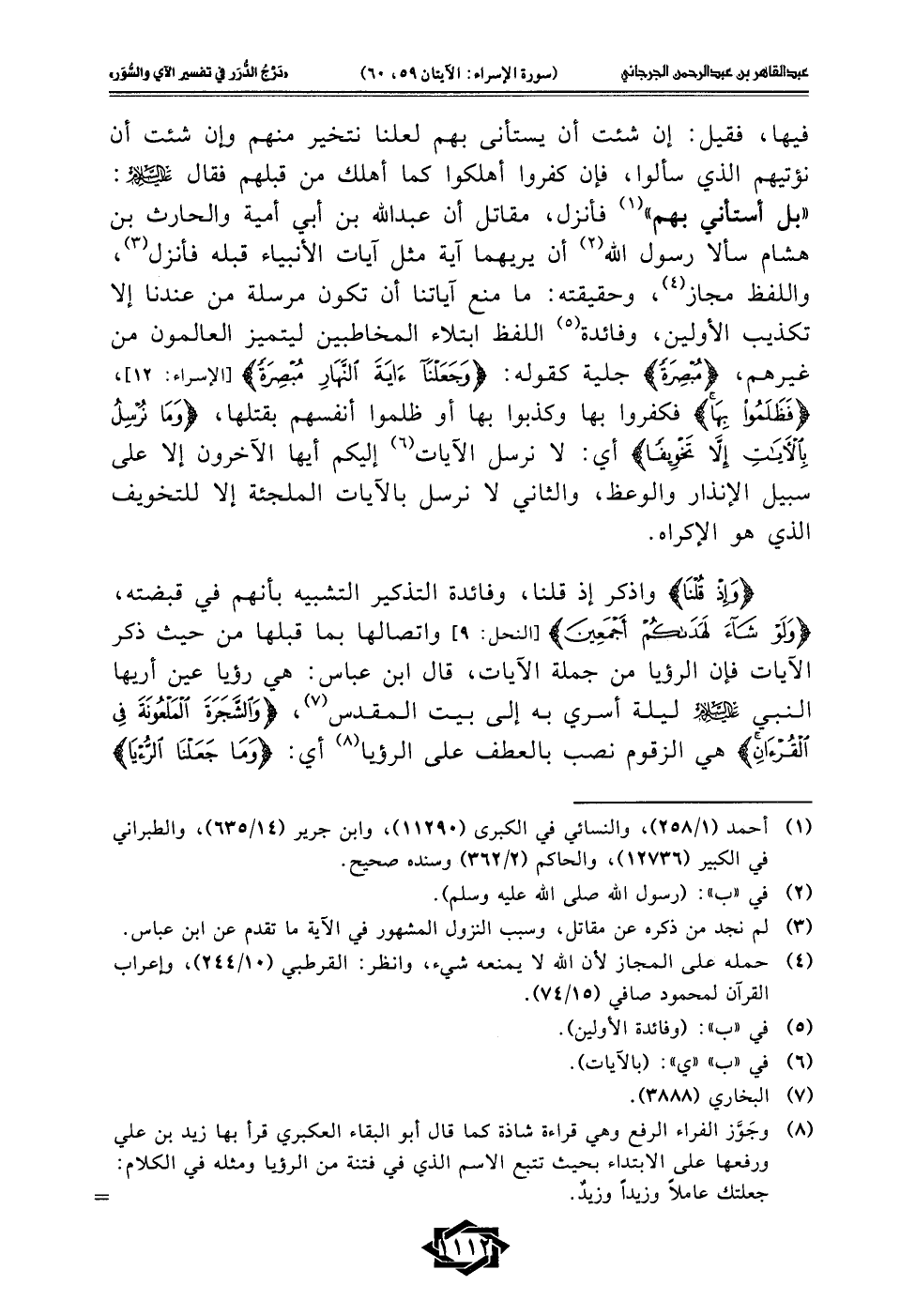 فيها، فقيل: إن شئت أن يستأنى بهم لعلنا نتخير منهم وإن شئت أن نؤتيهم الذي سألوا، فإن كفروا أهلكوا كما أهلك من قبلهم فقال -عليه السلام-: "بل أستأني بهم" (¬1) فأنزل، مقاتل أن عبد الله بن أبي أمية والحارث بن هشام سألا رسول الله (¬2) أن يريهما آية مثل آيات الأنبياء قبله فأنزل (¬3)، واللفظ مجاز (¬4)، وحقيقته: ما منع آياتنا أن تكون مرسلة من عندنا إلا تكذيب الأولين، وفائدة (¬5) اللفظ ابتلاء المخاطبين ليتميز العالمون من غيرهم، {مُبْصِرَةً} جلية كقوله: {وَجَعَلْنَا آيَةَ النَّهَارِ مُبْصِرَةً} [الإسراء: 12]، {فَظَلَمُوا بِهَا} فكفروا بها وكذبوا بها أو ظلموا أنفسهم بقتلها، {وَمَا نُرْسِلُ بِالْآيَاتِ إِلَّا تَخْوِيفًا} أي: لا نرسل الآيات (¬6) إليكم أيها الآخرون إلا على سبيل الإنذار والوعظ، والثاني لا نرسل بالآيات الملجئة إلا للتخويف الذي هو الإكراه.