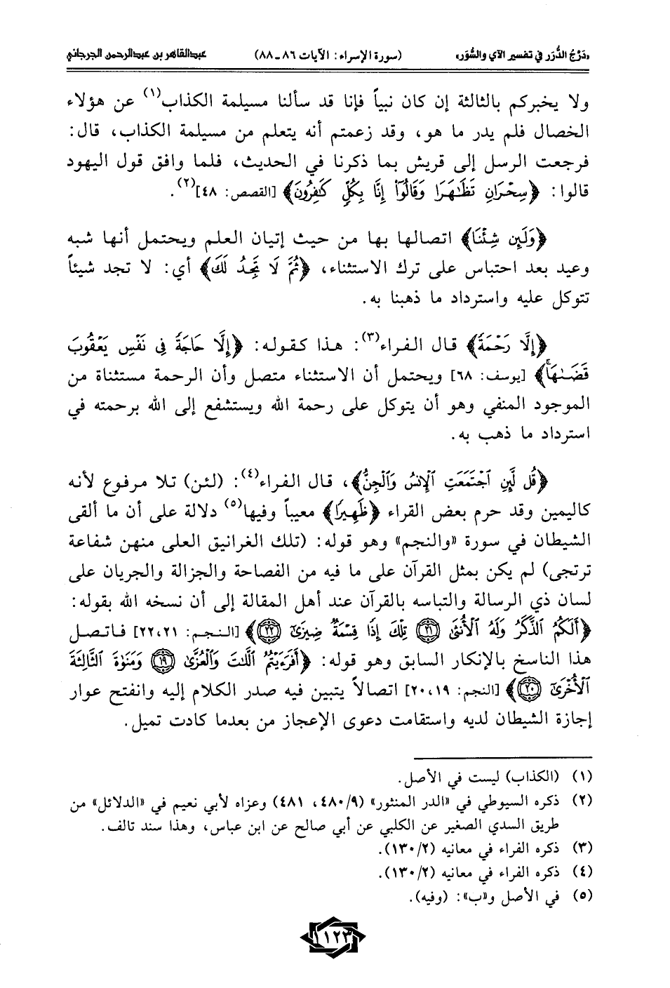 {قُلْ لَئِنِ اجْتَمَعَتِ الْإِنْسُ وَالْجِنُّ}، قال الفراء (¬4): (لئن) تلا مرفوع لأنه كاليمين وقد حرم بعض القراء {ظَهِيًرا} معيبًا وفيها (¬5) دلالة على أن ما ألقى الشيطان في سورة "والنجم" وهو قوله: (تلك الغرانيق العلى منهن شفاعة ترتجى) لم يكن بمثل القرآن على ما فيه من الفصاحة والجزالة والجريان على لسان ذي الرسالة والتباسه بالقرآن عند أهل المقالة إلى أن نسخه الله بقوله: {أَلَكُمُ الذَّكَرُ وَلَهُ الْأُنْثَى (21) تِلْكَ إِذًا قِسْمَةٌ ضِيزَى (22)} [النجم: 21، 22] فاتصل هذا الناسخ بالإنكار السابق وهو قوله: {أَفَرَأَيْتُمُ اللَّاتَ وَالْعُزَّى (19) وَمَنَاةَ الثَّالِثَةَ الْأُخْرَى (20)} [النجم: 19، 20]، اتصالا يتبين فيه صدر الكلام إليه وانفتح عوار إجازة الشيطان لديه واستقامت دعوى الإعجاز من بعد ما كادت تميل.