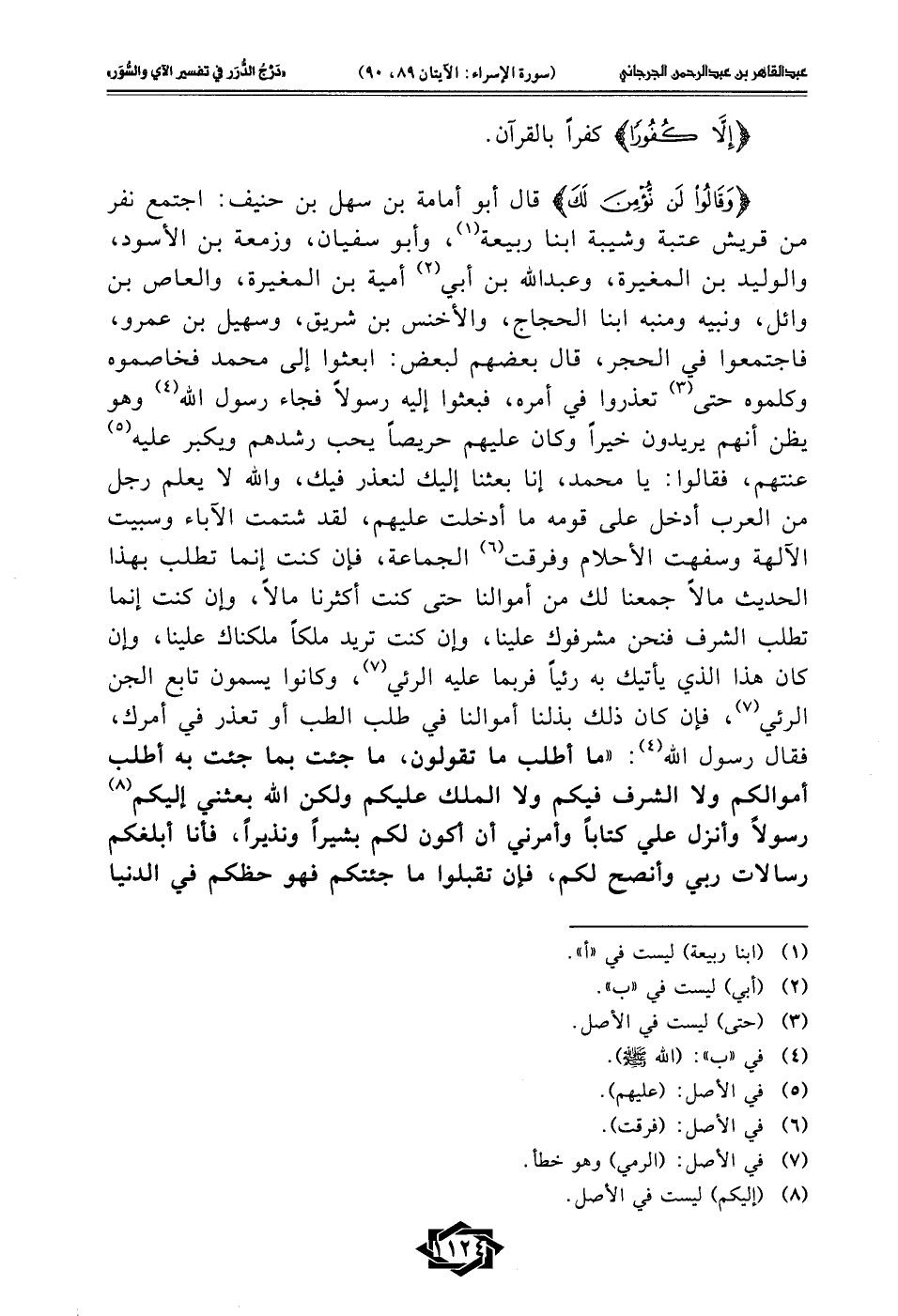 {وَقَالُوا لَنْ نُؤْمِنَ لَكَ} قال أبو أمامة بن سهل بن حنيف: اجتمع نفر من قريش عتبة وشيبة ابنا ربيعة (¬1)، وأبو سفيان، وزمعة بن الأسود، والوليد بن المغيرة، وعبد الله بن أبي (¬2) أمية بن المغيرة، والعاص بن وائل، ونبيه ومنبه ابنا الحجاج، والأخنس بن شريق، وسهيل بن عمرو، فاجتمعوا في الحجر، قال بعضهم لبعض: ابعثوا إلى محمَّد فخاصموه وكلموه حتى (¬3) تعذروا في أمره، فبعثوا إليه رسولًا فجاء رسول الله (¬4) وهو يظن أنهم يريدون خيرًا وكان عليهم حريصًا يحب رشدهم ويكبر عليه (¬5) عنتهم، فقالوا: يا محمَّد، إنا بعثنا إليك لنعذر فيك، والله لا يعلم رجل من العرب أدخل على قومه ما أدخلت عليهم، لقد شتمت الآباء وسبيت الآلهة وسفهت الأحلام وفرقت (¬6) الجماعة، فإن كنت إنما تطلب بهذا الحديث مالًا جمعنا لك من أموالنا حتى كنت أكثرنا مالًا، وإن كنت إنما تطلب الشرف فنحن مشرفوك علينا، وإن كنت تريد ملكا ملكناك علينا، وإن كان هذا الذي يأتيك به رئيًا فربما عليه الرئي (¬7)، وكانوا يسمون تابع الجن الرئي (7)، فإن كان ذلك بذلنا أموالنا في طلب الطب أو تعذر في أمرك، فقال رسول الله (4): "ما أطلب ما تقولون، ما جئت بما جئت به أطلب أموالكم ولا الشرف فيكم ولا الملك عليكم ولكن الله بعثني إليكم (¬8) رسولًا وأنزل علي كتابًا وأمرني أن أكون لكم بشيرًا ونذيرًا، فأنا أبلغكم رسالات ربي وأنصح لكم، فإن تقبلوا ما جئتكم فهو حظكم في الدنيا
