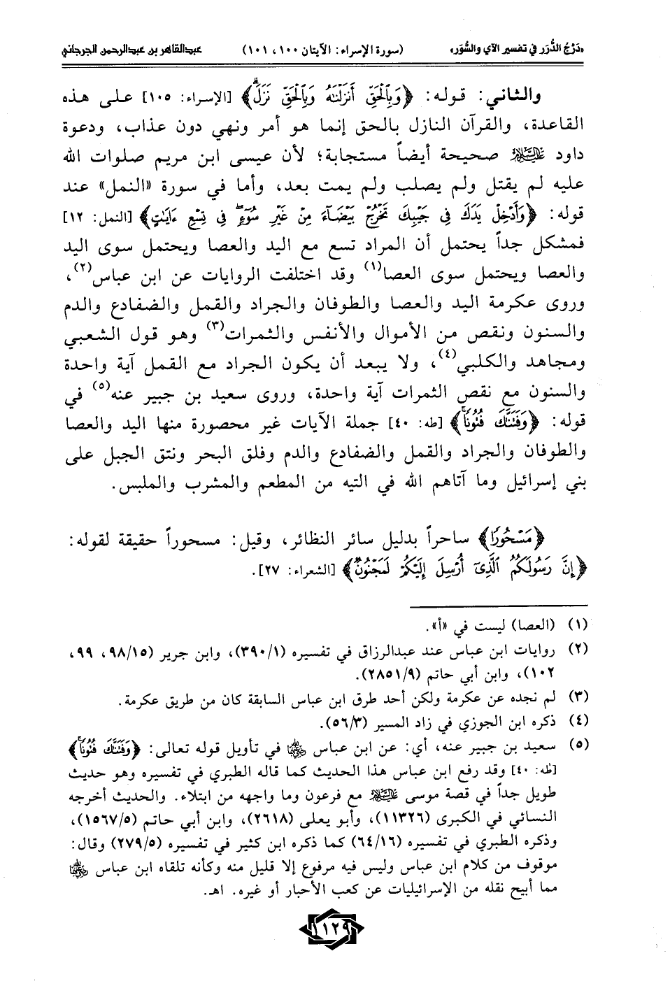 والثاني: قوله: {وَبِالْحَقِّ أَنْزَلْنَاهُ وَبِالْحَقِّ نَزَلَ} [الإسراء: 105]، على هذه القاعدة، والقرآن النازل بالحق إنما هو أمر ونهي دون عذاب، ودعوة داود -عليه السلام- صحيحة أيضًا مستجابة؛ لأنّ عيسى ابن مريم صلوات الله عليه لم يقتل ولم يصلب ولم يمت بعد، وأما في سورة "النمل" عند قوله: {وَأَدْخِلْ يَدَكَ فِي جَيْبِكَ تَخْرُجْ بَيْضَاءَ مِنْ غَيْرِ سُوءٍ فِي تِسْعِ آيَاتٍ} [النمل: 12]، فمشكل جدًا يحتمل أن المراد تسع مع اليد والعصا ويحتمل سوى اليد والعصا ويحتمل سوى العصا (¬1) وقد اختلفت الروايات عن ابن عباس (¬2)، وروى عكرمة اليد والعصا والطوفان والجراد والقمل والضفادع والدم والسنون ونقص من الأموال والأنفس والثمرات (¬3) وهو قول الشعبي ومجاهد والكلبي (¬4)، ولا يبعد أن يكون الجراد مع القمل آية واحدة والسنون مع نقص الثمرات آية واحدة، وروى سعيد بن جبير عنه (¬5) في قوله: {وَفَتَنَّاكَ فُتُونًا} [طه: 40]، جملة الآيات غير محصورة منها اليد والعصا والطوفان والجراد والقمل والضفادع والدم وفلق البحر ونتق الجبل على بني إسرائيل وما آتاهم الله في التيه من المطعم والمشرب والملبس.