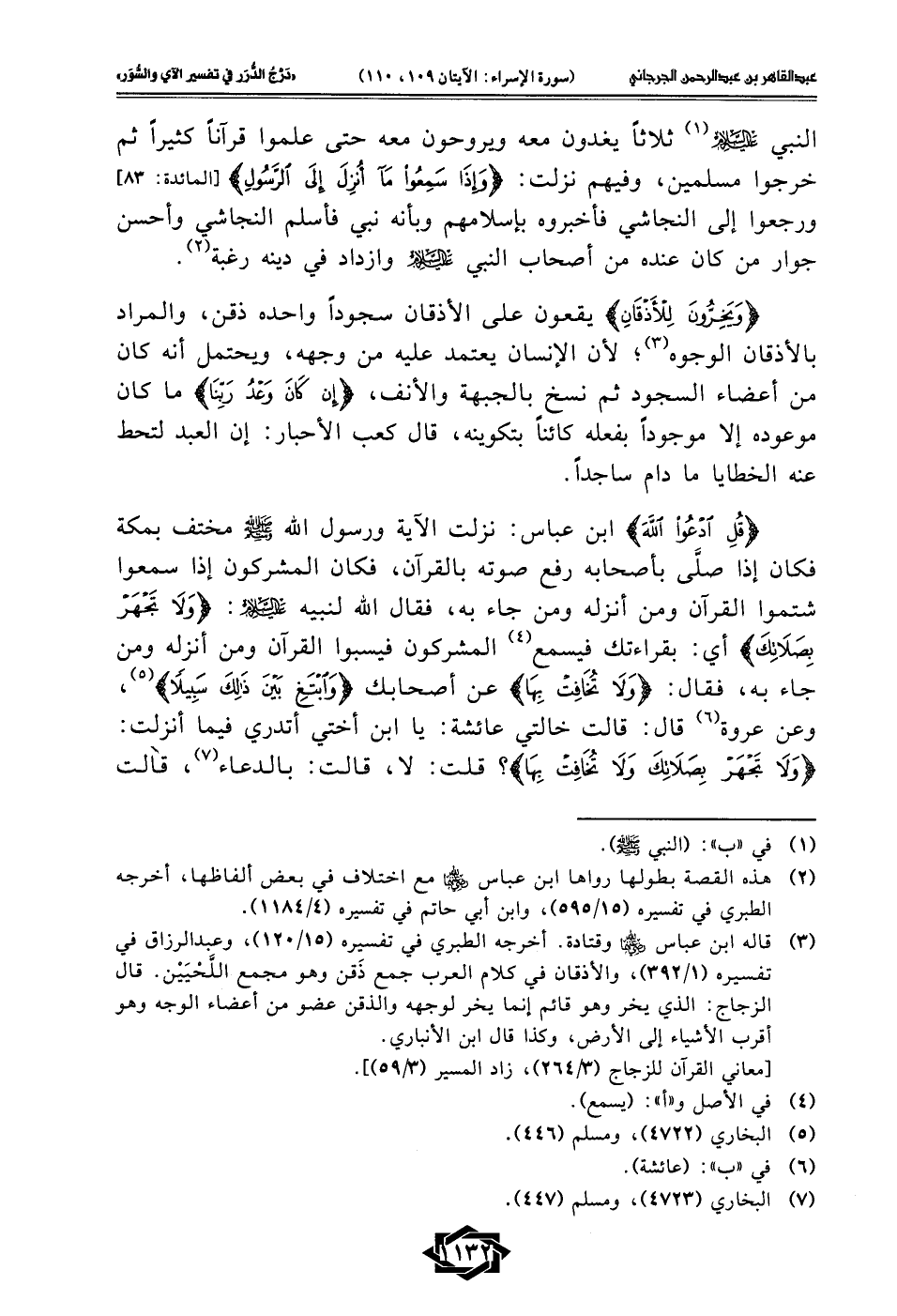 (¬3) قاله ابن عباس - رضي الله عنهما - وقتادة. أخرجه الطبري في تفسيره (15/ 120)، وعبد الرزاق في تفسيره (1/ 392)، والأذقان في كلام العرب جمع ذَقن وهو مجمع اللَّحْيَيْن. قال الزجاج: الذي يخر وهو قائم إنما يخر لوجهه والذقن عضو من أعضاء الوجه وهو أقرب الأشياء إلى الأرض، وكذا قال ابن الأنباري.