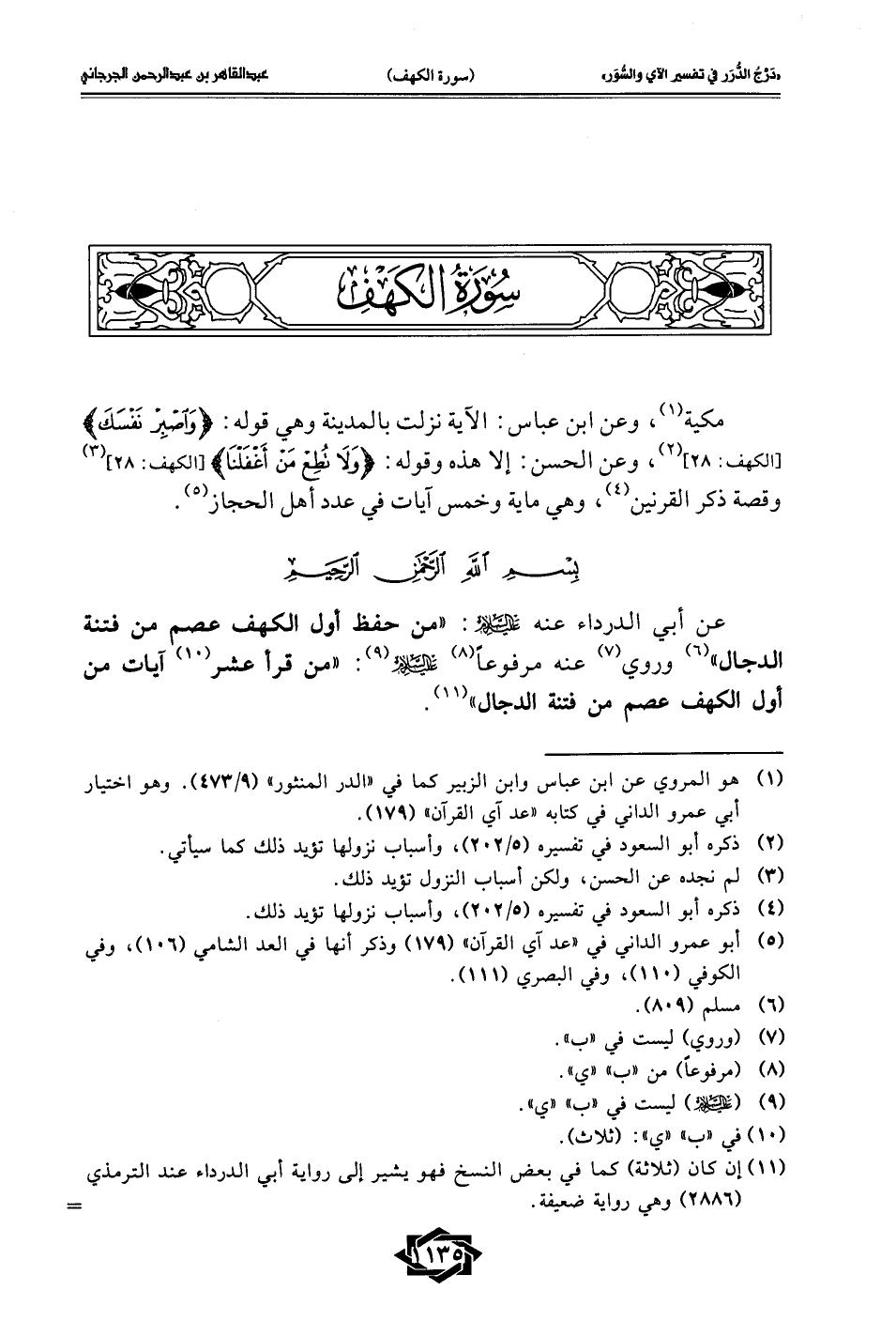 عن أبي الدرداء عنه -عليه السلام-: "من حفظ أول الكهف عصم من فتنة الدجال" (¬6) وروي (¬7) عنه مرفوعًا (¬8) -عليه السلام- (¬9): "من قرأ عشر (¬10) آيات من أول الكهف عصم من فتنة الدجال" (¬11).