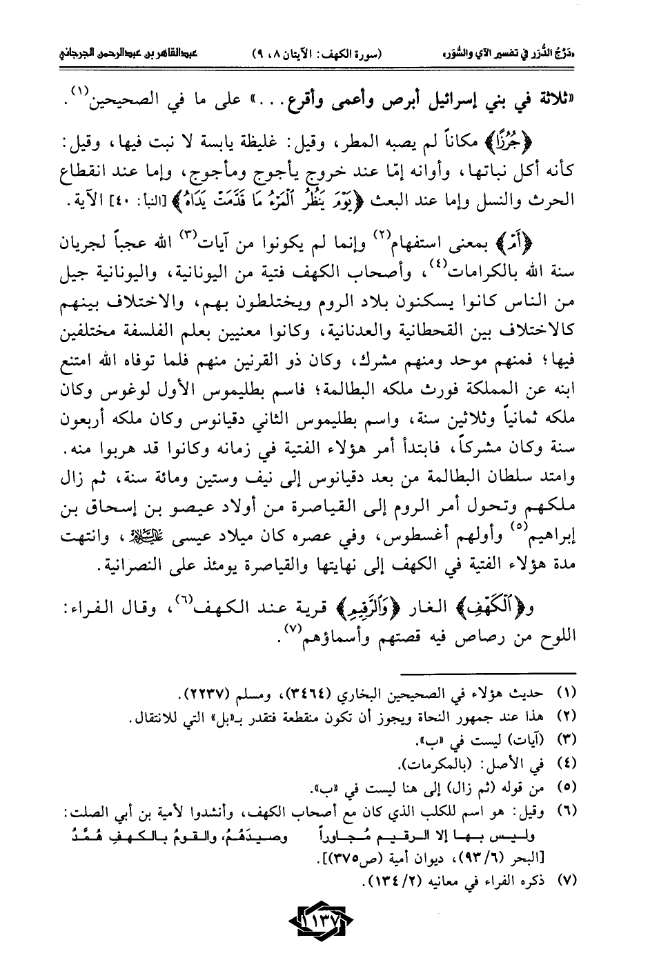 {أَمْ} بمعنى استفهام (¬2) وإنما لم يكونوا من آيات (¬3) الله عجبًا لجريان سنة الله بالكرامات (¬4)، وأصحاب الكهف فتية من اليونانية، واليونانية جيل من الناس كانوا يسكنون بلاد الروم ويختلطون بهم، والاختلاف بينهم كالاختلاف بين القحطانية والعدنانية، وكانوا معنيين بعلم الفلسفة مختلفين فيها؛ فمنهم موحد ومنهم مشرك، وكان ذو القرنين منهم فلما توفاه الله امتنع ابنه عن المملكة فورث ملكه البطالمة؛ قاسم بطليموس الأول لوغوس وكان ملكه ثمانيًا وثلاثين سنة، واسم بطليموس الثاني دقيانوس وكان ملكه أربعون سنة وكان مشركًا، فابتدا أمر هؤلاء الفتية في زمانه وكانوا قد هربوا منه. وامتد سلطان البطالمة من بعد دقيانوس إلى نيف وستين ومائة سنة، ثم زال ملكهم وتحول أمر الروم إلى القياصرة من أولاد عيصو بن إسحاق بن إبراهيم (¬5) وأولهم أغسطوس، وفي عصره كان ميلاد عيسى -عليه السلام-، وانتهت مدة هؤلاء الفتية في الكهف إلى نهايتها والقياصرة يومئذ على النصرانية.