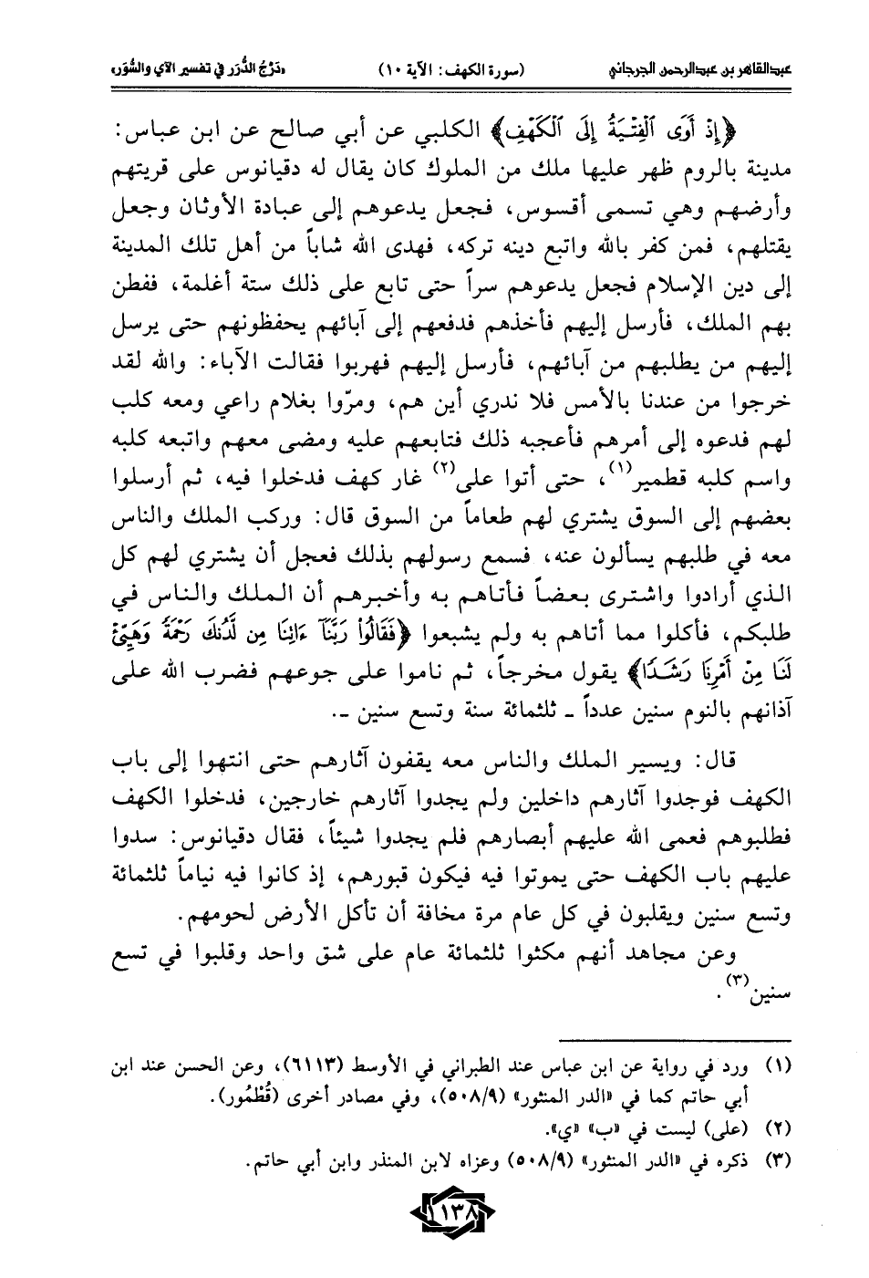 {إِذْ أَوَى الْفِتْيَةُ إِلَى الْكَهْفِ} الكلبي عن أبي صالح عن ابن عباس: مدينة بالروم ظهر عليها ملك من الملوك كان يقال له دقيانوس على قريتهم وأرضهم وهي تسمى أقسوس، فجعل يدعوهم إلى عبادة الأوثان وجعل يقتلهم، فمن كفر بالله واتبع دينه تركه، فهدى الله شابًا من أهل تلك المدينة إلى دين الإسلام فجعل يدعوهم سرًا حتى تابع على ذلك ستة أغلمة، ففطن بهم الملك، فأرسل إليهم فأخذهم فدفعهم إلى آبائهم يحفظونهم حتى يرسل إليهم من يطلبهم من آبائهم، فأرسل إليهم فهربوا فقالت الآباء: والله لقد خرجوا من عندنا بالأمس فلا ندري أين هم، ومرّوا بغلام راعي ومعه كلب لهم فدعوه إلى أمرهم فأعجبه ذلك فتابعهم عليه ومضى معهم واتبعه كلبه واسم كلبه قطمير (¬1)، حتى أتوا على (¬2) غار كهف فدخلوا فيه، ثم أرسلوا بعضهم إلى السوق يشتري لهم طعامًا من السوق قال: وركب الملك والناس معه في طلبهم يسألون عنه، فسمع رسولهم بذلك فعجل أن يشتري لهم كل الذي أرادوا واشترى بعضًا فأتاهم به وأخبرهم أن الملك والناس في طلبكم، فأكلوا مما أتاهم به ولم يشبعوا {فَقَالُوا رَبَّنَا آتِنَا مِنْ لَدُنْكَ رَحْمَةً وَهَيِّئْ لَنَا مِنْ أَمْرِنَا رَشَدًا} يقول مخرجًا، ثم ناموا على جوعهم فضرب الله على آذانهم بالنوم سنين عددًا -ثلثمائة سنة وتسع سنين-.