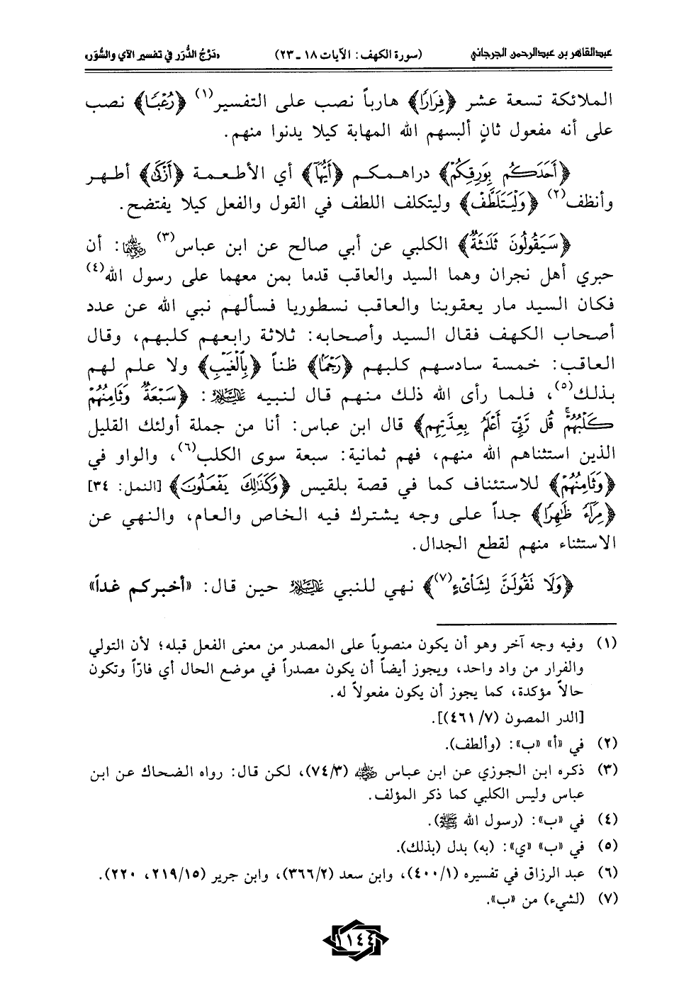 {سَيَقُولُونَ ثَلَاثَةٌ} الكلبي عن أبي صالح عن ابن عباس (¬3) - رضي الله عنهما -: أن حبري أهل نجوان وهما السيد والعاقب قدما بمن معهما على رسول الله (¬4) فكان السيد مار يعقوبنا والعاقب نسطوريا فسألهم نبي الله عن عدد أصحاب الكهف فقال السيد وأصحابه: ثلاثة رابعهم كلبهم، وقال العاقب: خمسة سادسهم كلبهم {رَجْمًا} ظنا {بِالْغَيْبِ} ولا علم لهم بذلك (¬5)، فلما رأى الله ذلك منهم قال لنبيه -عليه السلام-: {سَبْعَةٌ وَثَامِنُهُمْ كَلْبُهُمْ قُلْ رَبِّي أَعْلَمُ بِعِدَّتِهِمْ} قال ابن عباس: أنا من جملة أولئك القليل الذين استثناهم الله منهم، فهم ثمانية: سبعة سوى الكلب (¬6)، والواو في {وَثَامِنُهُمْ} للاستئناف كما في قصة بلقيس {وَكَذَلِكَ يَفْعَلُونَ} [النمل: 34] {مِرَاءً ظَاهِرًا} جدًا على وجه يشترك فيه الخاص والعام، والنهي عن الاستثناء منهم لقطع الجدال.