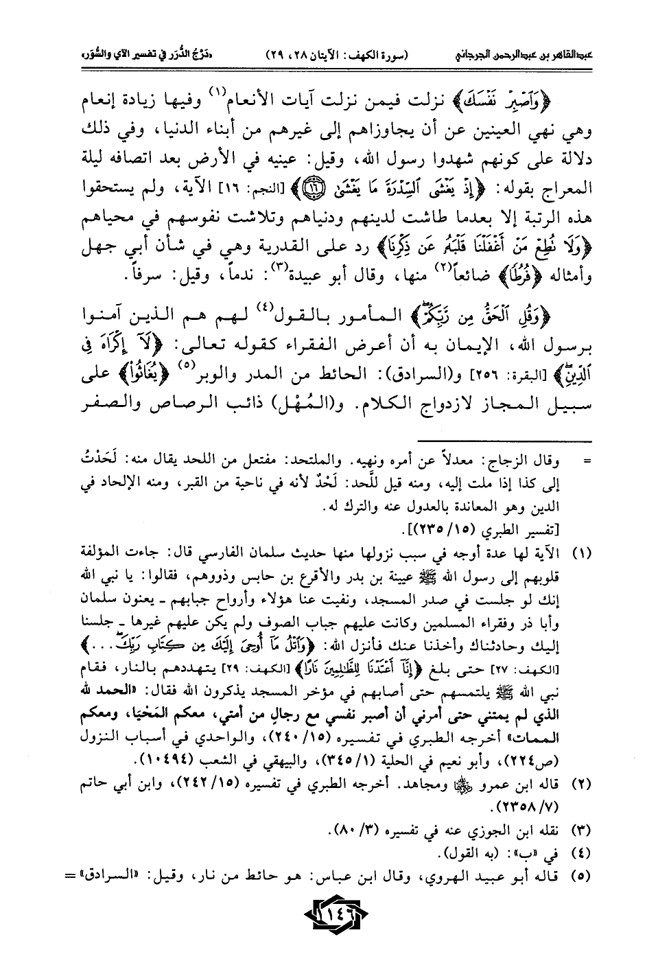 (¬1) الآية لها عدة أوجه في سبب نزولها منها حديث سلمان الفارسي قال: جاءت المؤلفة قلوبهم إلى رسول الله -صلى الله عليه وسلم- عيينة بن بدر والأقرع بن حابس وذووهم، فقالوا: يا نبي الله إنك لو جلست في صدر المسجد، ونفيت عنا هؤلاء وأرواح جبابهم - يعنون سلمان وأبا ذر وفقراء المسلمين وكانت عليهم جباب الصوف ولم يكن عليهم غيرها - جلسنا إليك وحادثناك وأخذنا عنك فأنزل الله: {وَاتْلُ مَا أُوحِيَ إِلَيْكَ مِنْ كِتَابِ رَبِّكَ ...} [الكهف: 27]، حتى بلغ {إِنَّا أَعْتَدْنَا لِلظَّالِمِينَ نَارًا} [الكهف: 29]، يتهددهم بالنار، فقام نبي الله- صلى الله عليه وسلم - يلتمسهم حتى أصابهم في مؤخر المسجد يذكرون الله فقال: "الحمد لله الذي لم يمتني حتى أمرني أن أصبر نفسي مع رجالٍ من أمتي، معكم المَحْيَا، ومعكم الممات" أخرجه الطبري في تفسيره (15/ 240)، والواحدي في أسباب النزول (ص 224)، وأبو نجم في الحلية (1/ 345)، والبيهقي في الشعب (10494).