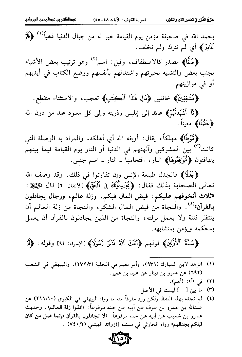 {جَدَلًا} فالجدل طبيعة الإنس وإن تفاوتوا في ذلك. وقد وصف الله تعالى الصحابة بذلك فقال: {يُجَادِلُونَكَ فِي الْحَقِّ} [الأنفال: 6] قال -عليه السلام-: "ثلاث أتخوفهم عليكم: فيض المال فيكم، وزلة عالم، ورجال يجادلون بالقرآن" (¬4). والنجاة من فيض المال الشكر، والنجاة من زلة العالم أن ينتظر فتنة ولا يعمل بزلته، والنجاة من الذين يجادلون بالقرآن أن يعمل بمحكمه ويؤمن بمتشابهه.
