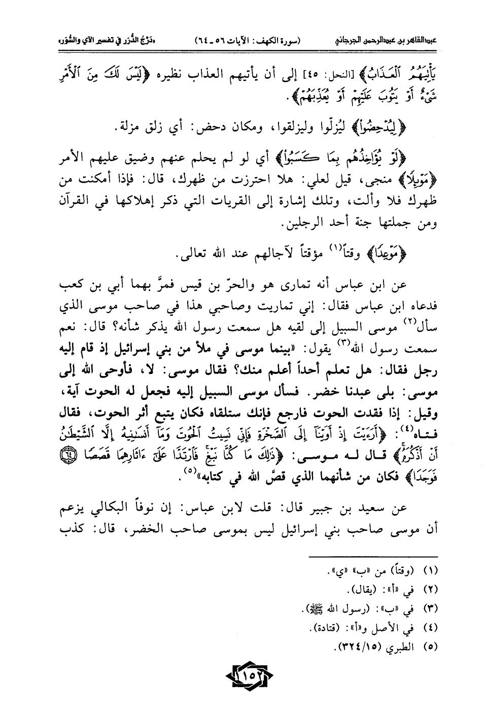 عن ابن عباس أنه تمارى هو والحرّ بن قيس فمرَّ بهما أبي بن كعب فدعاه ابن عباس فقال: إني تماريت وصاحبي هذا في صاحب موسى الذي سأل (¬2) موسى السبيل إلى لقيه هل سمعت رسول الله يذكر شأنه؟ قال: نعم سمعت رسول الله (¬3) يقول: "بينما موسى في ملأ من بني إسرائيل إذ قام إليه رجل فقال: هل تعلم أحدًا أعلم منك؟ فقال موسى: لا، فأوحى الله إلى موسى: بلى عبدنا خضر. فسأل موسى السبيل إليه فجعل له الحوت آية، وقيل: إذا فقلت الحوت فارجع فإنك ستلقاه فكان يتبع أثر الحوت، فقال فتاه (¬4): {أَرَأَيْتَ إِذْ أَوَيْنَا إِلَى الصَّخْرَةِ فَإِنِّي نَسِيتُ الْحُوتَ وَمَا أَنْسَانِيهُ إِلَّا الشَّيْطَانُ أَنْ أَذْكُرَهُ} قال له موسى: {ذَلِكَ مَا كُنَّا نَبْغِ فَارْتَدَّا عَلَى آثَارِهِمَا قَصَصًا (64) فَوَجَدَا} فكان من شأنهما الذي قصَّ الله في كتابه" (¬5).