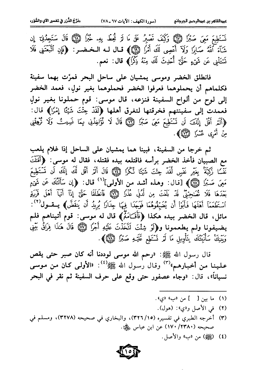 قال رسول الله -صلى الله عليه وسلم-: "رحم الله موسى لوددنا أنه كان صبر حتى يقص علينا من أخبارهم" (¬3) وقال رسول الله -صلى الله عليه وسلم- (¬4):"الأولى كان من موسى نسيانًا"، قال: "وجاء عصفور حتى وقع على حرف السفينة ثم نقر في البحر