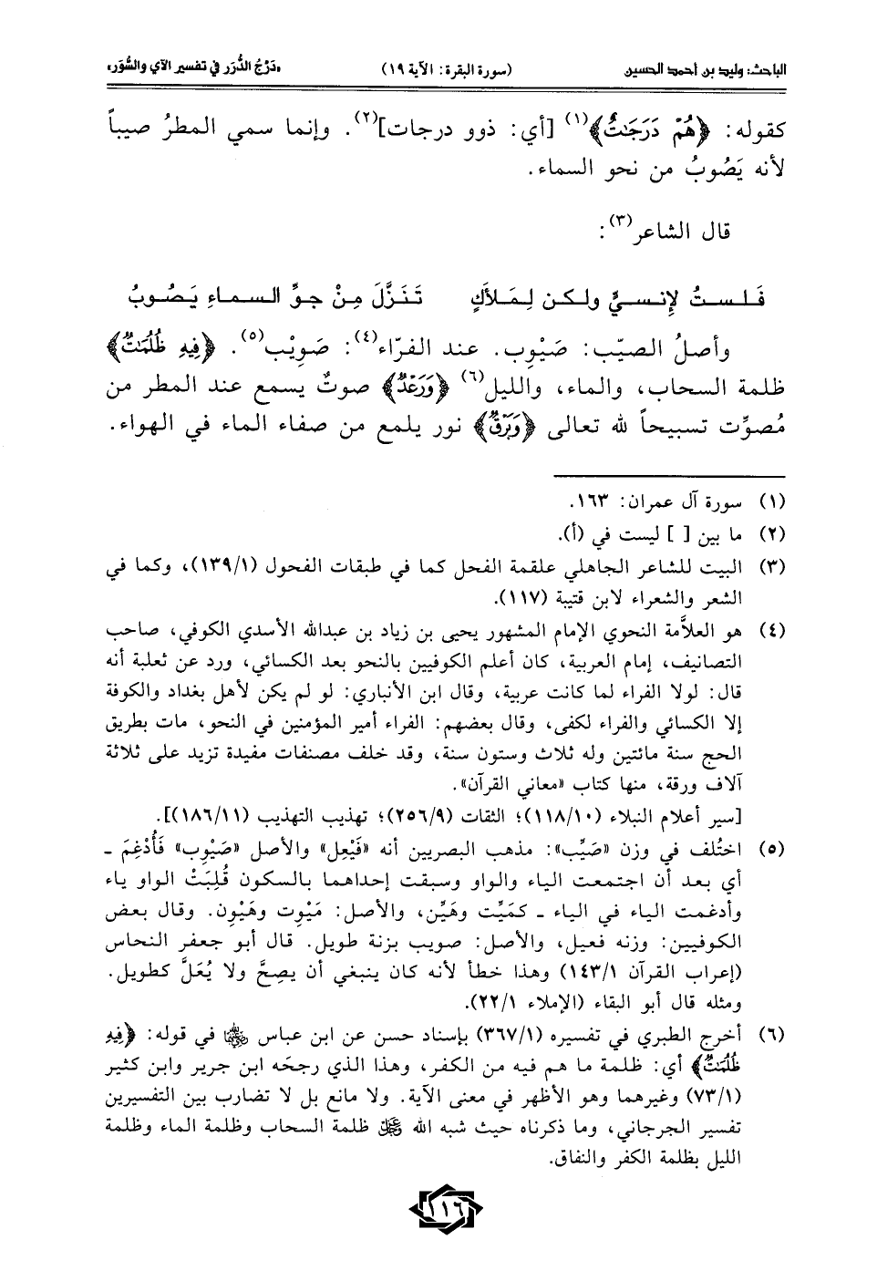 (¬6) أخرج الطبري في تفسيره (1/ 367) بإسناد حسن عن ابن عباس - رضي الله عنهما - في قوله: {فِيهِ ظُلُمَاتٌ} أي: ظلمة ما هم فيه من الكفر، وهذا الذي رجحَه ابن جرير وابن كثير (1/ 73) وغيرهما وهو الأظهر في معنى الآية. ولا مانع بل لا تضارب بين التفسيرين تفسير الجرجاني، وما ذكرناه حيث شبه الله - عَزَّ وَجَلَّ - ظلمة السحاب وظلمة الماء وظلمة الليل بظلمة الكفر والنفاق.