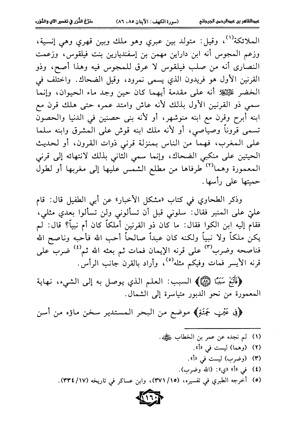 وذكر الطحاوي في كتاب "مشكل الأخبار" عن أبي الطفيل قال: قام عليّ على المنبر فقال: سلوني قبل أن تسألوني ولن تسألوا بعدي مثلي، فقام إليه ابن الكوا فقال: ما كان ذو القرنين أملكًا كان أم نبيًا؟ قال: لم يكن ملكًا ولا نبيًا ولكنه كان عبدًا صالحًا أحب الله فأحبه وناصح الله فناصحه وضرب (¬3) على قرنه الإيمان فمات ثم بعثه الله ثم (¬4) ضرب على قرنه الأيسر فمات وفيكم مثله (¬5)، وأراد بالقرن جانب الرأس.