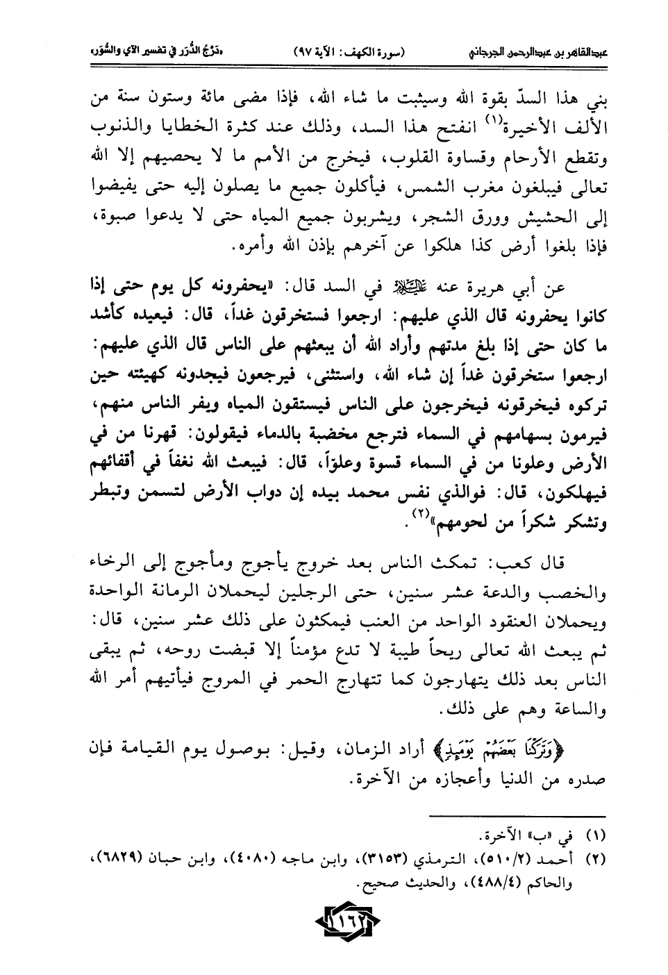 عن أبي هريرة عنه - عليه السلام - في السد قال: "يحفرونه كل يوم حتى إذا كانوا يحفرونه قال الذي عليهم: ارجعوا فستخرقون غدًا، قال: فيعيده كأشد ما كان حتى إذا بلغ مدتهم وأراد الله أن يبعثهم على الناس قال الذي عليهم: ارجعوا ستخرقون غدًا إن شاء الله، واستثنى، فيرجعون فيجدونه كهيئته حين تركوه فيخرقونه فيخرجون على الناس فيستقون المياه ويفر الناس منهم، فيرمون بسهامهم في السماء فترجع مخضبة بالدماء فيقولون: قهرنا من في الأرض وعلونا من في السماء قسوة وعلوًّا، قال: فيبعث الله نغفًا في أقفائهم فيهلكون، قال: فوالذي نفس محمَّد بيده إن دواب الأرض لتسمن وتبطر وتشكر شكرًا من لحومهم" (¬2).