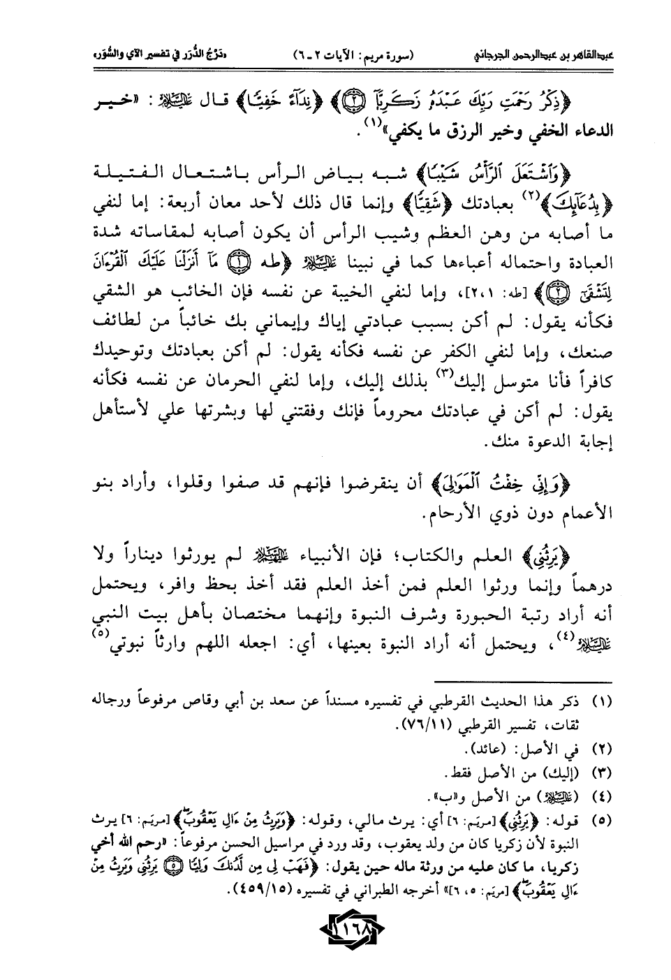 (¬5) قوله: {يَرِثُنِي} [مريم: 6] أي: يرث مالي، وقوله: {وَيَرِثُ مِنْ آلِ يَعْقُوبَ} [مريم: 6] يرث النبوة لأن زكريا كان من ولد يعقوب، وقد ورد في مراسيل الحسن مرفوعًا: "رحم الله أخي زكريا، ما كان عليه من ورثة ماله حين يقول: {فَهَبْ لِي مِنْ لَدُنْكَ وَلِيًّا (5) يَرِثُنِي وَيَرِثُ مِنْ آلِ يَعْقُوبَ} [مريم: 5، 6] أخرجه الطبراني في تفسيره (15/ 459).