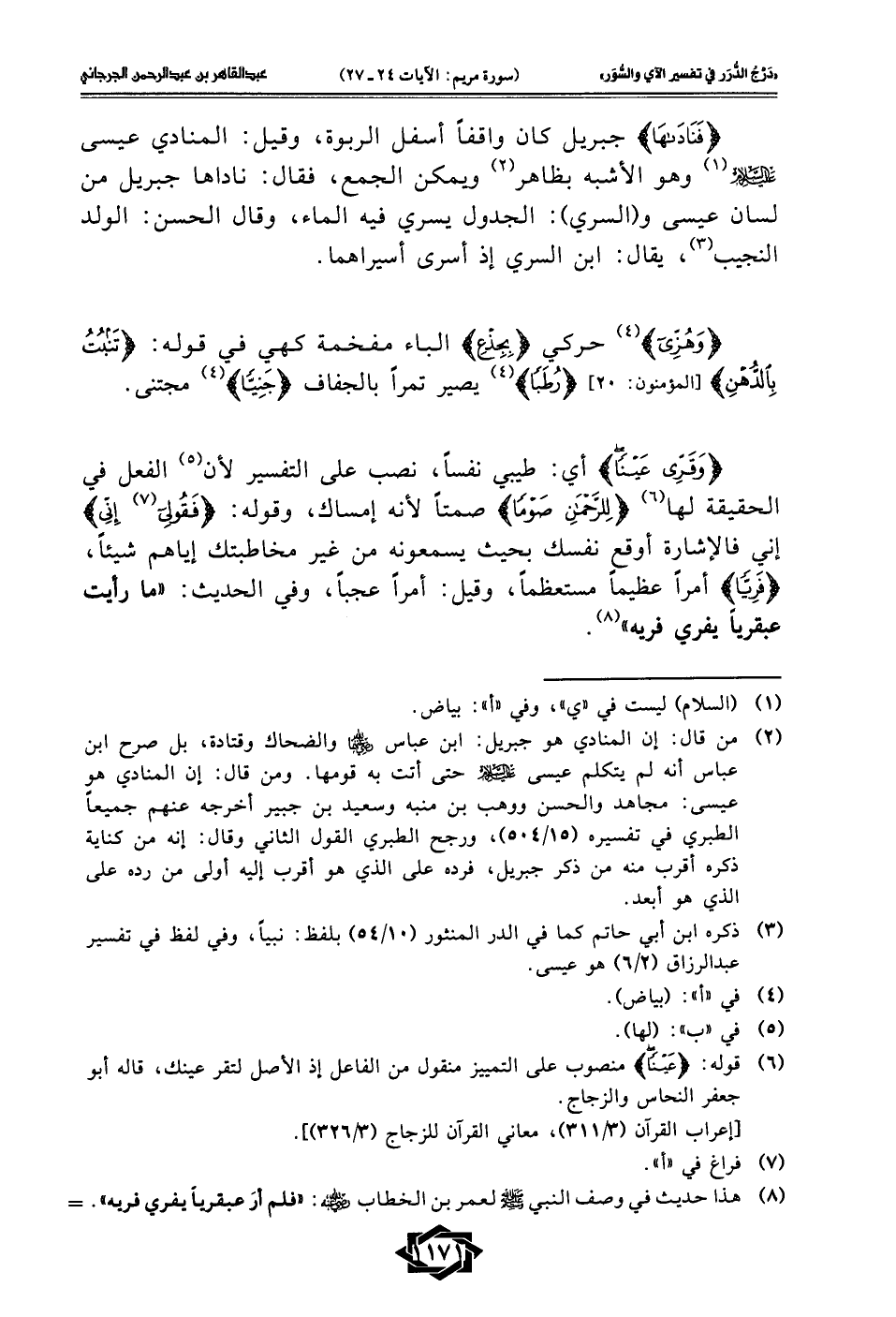 (¬2) من قال: إن المنادي هو جبريل: ابن عباس - رضي الله عنهما - والضحاك وقتادة، بل صرح ابن عباس أنه لم يتكلم عيسى -عليه السلام- حتى أتت به قومها. ومن قال: إن المنادي هو عيسى: مجاهد والحسن ووهب بن منبه وسعيد بن جبير أخرجه عنهم جميعًا الطبري في تفسيره (15/ 504)، ورجح الطبري القول الثاني وقال: إنه من كناية ذكره أقرب منه من ذكر جبريل، فرده على الذي هو أقرب إليه أولى من رده على الذي هو أبعد.