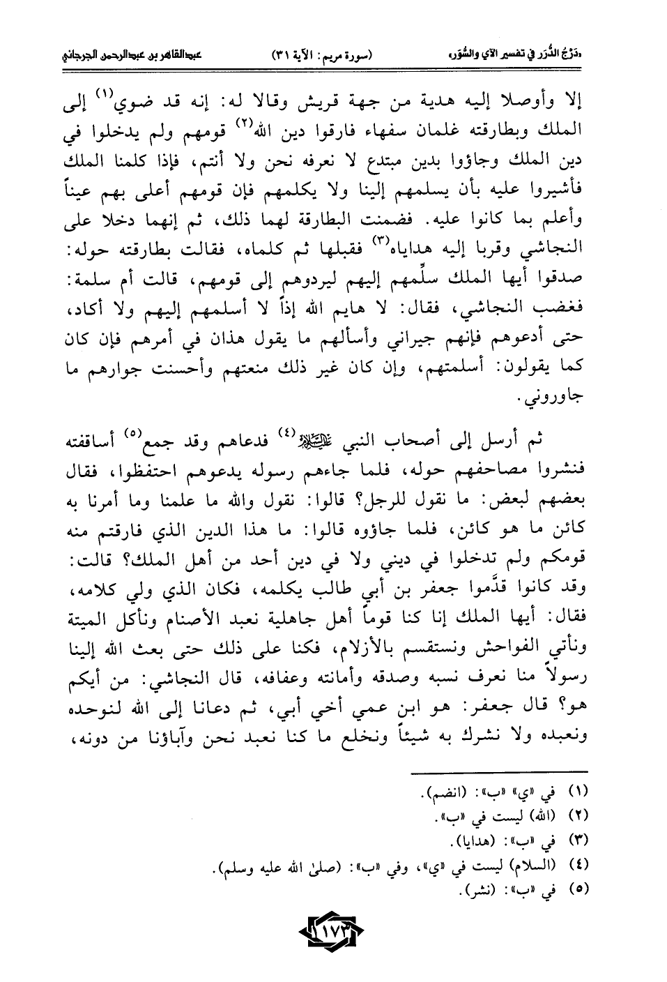 ثم أرسل إلى أصحاب النبي - عليه السلام - (¬4) فدعاهم وقد جمع (¬5) أساقفته فنشروا مصاحفهم حوله، فلما جاءهم رسوله يدعوهم احتفظوا، فقال بعضهم لبعض: ما نقول للرجل؟ قالوا: نقول والله ما علمنا وما أمرنا به كائن ما هو كائن، فلما جاؤوه قالوا: ما هذا الدين الذي فارقتم منه قومكم ولم تدخلوا في ديني ولا في دين أحد من أهل الملك؟ قالت: وقد كانوا قدَّموا جعفر بن أبي طالب يكلمه، فكان الذي ولي كلامه، فقال: أيها الملك إنا كنا قومًا أهل جاهلية نعبد الأصنام ونأكل الميتة ونأتي الفواحش ونستقسم بالأزلام، فكنا على ذلك حتى بعث الله إلينا رسولًا منا نعرف نسبه وصدقه وأمانته وعفافه، قال النجاشي: من أيكم هو؟ قال جعفر: هو ابن عمي أخي أبي، ثم دعانا إلى الله لنوحده ونعبده ولا نشرك به شيئًا ونخلع ما كنا نعبد نحن وآباؤنا من دونه،