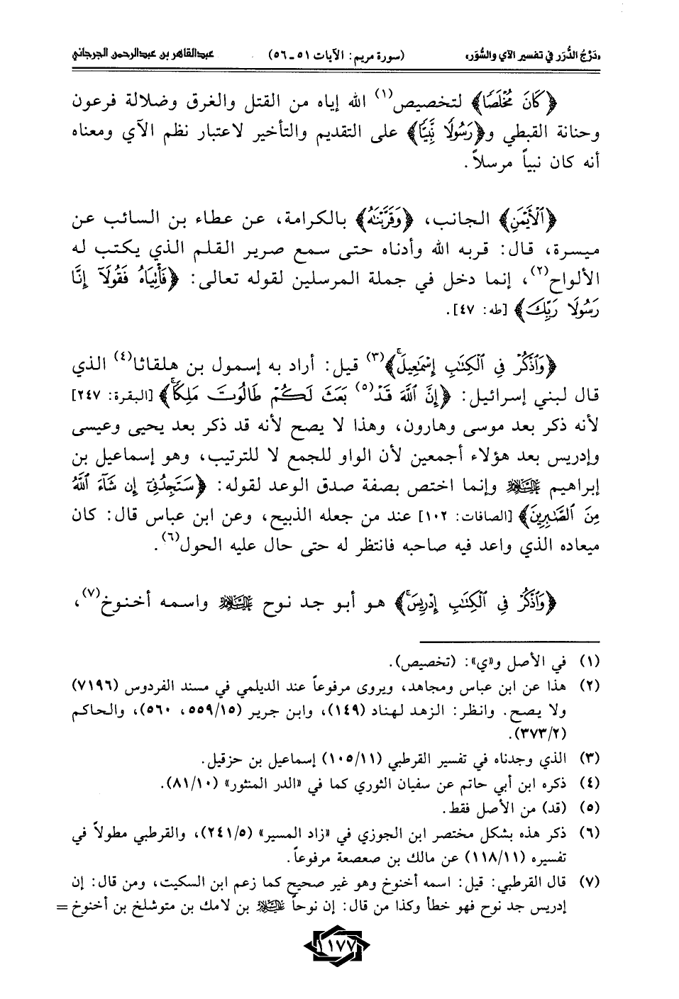 (¬7) قال القرطبي: قيل: اسمه أخنوخ وهو غير صحيح كما زعم ابن السكيت، ومن قال: إن إدريس جد نوح فهو خطأ وكذا من قال: إن نوحًا -عليه السلام- بن لامك بن متوشلخ بن أخنوخ =