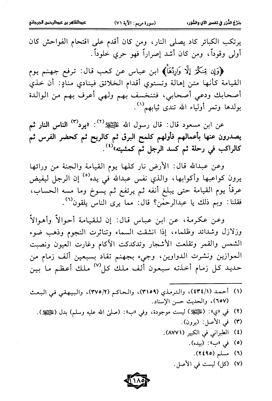 {وَإِنْ مِنْكُمْ إِلَّا وَارِدُهَا} ابن عباس عن كعب قال: ترفع جهنم يوم القيامة كأنها متن إهالة وتستوي أقدام الخلائق فينادي منادٍ: أن خذي أصحابك ودعي أصحابي، فتنخسف بهم ولهي أعرف بهم من الوالدة بولدها وتمر أولياء الله تندى ثيابهم (¬1).
